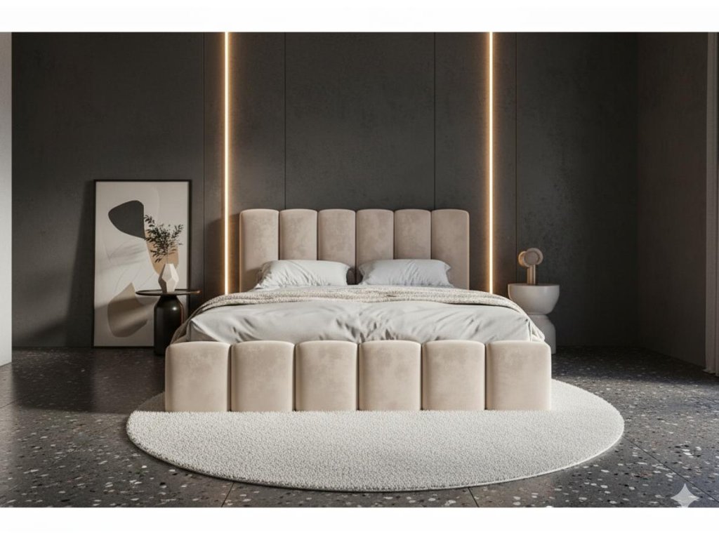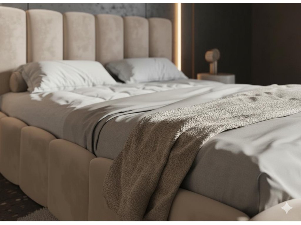 - Elegantná čalúnená posteľ s veľkým úložným priestorom - ideálna na lôžkoviny a sezónne textílie.