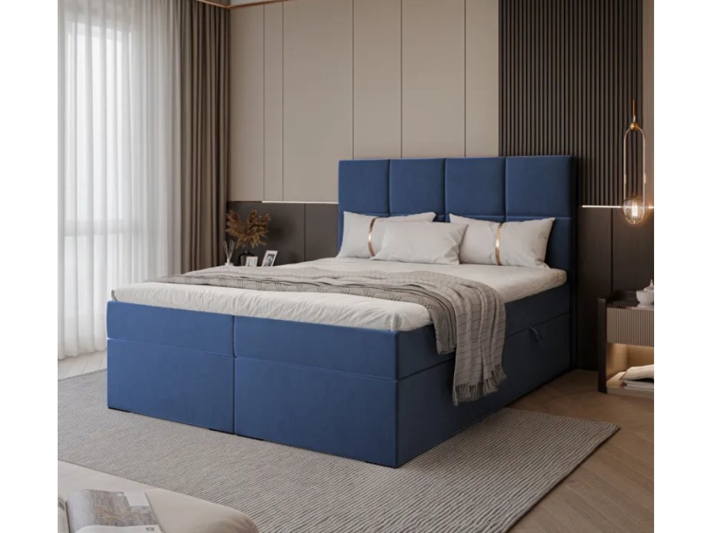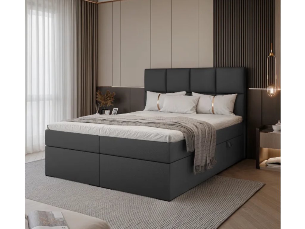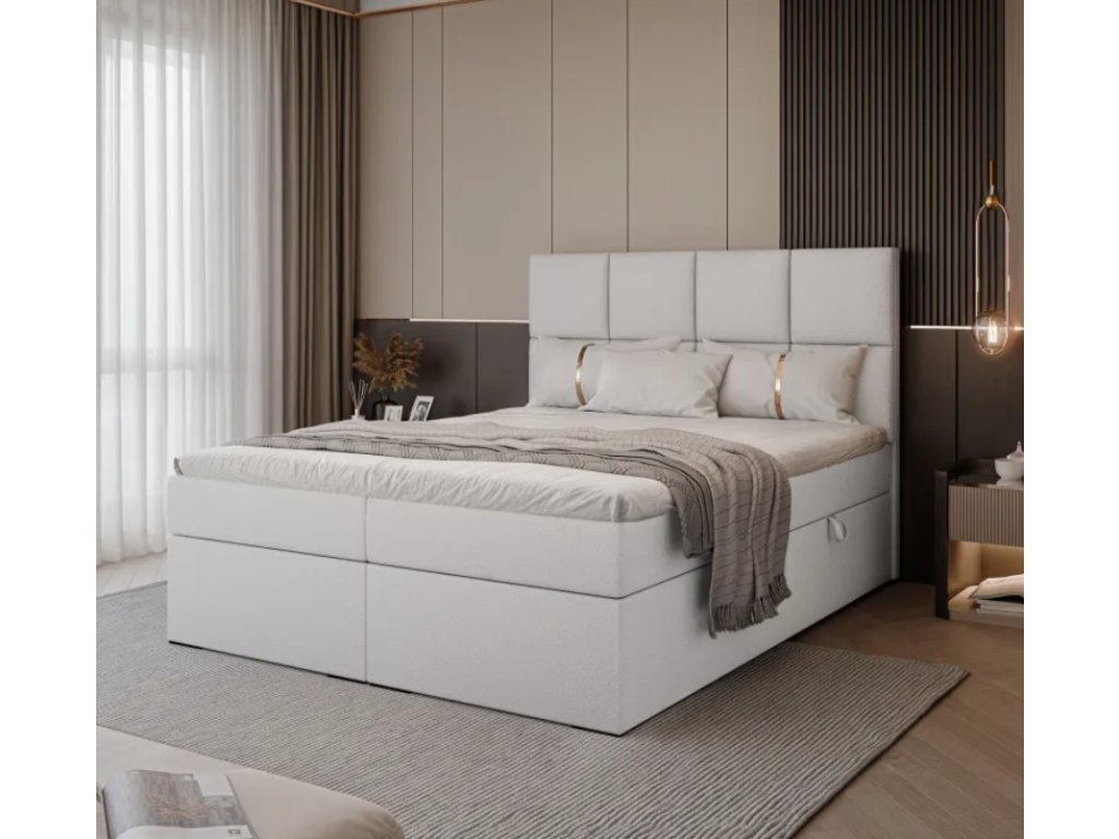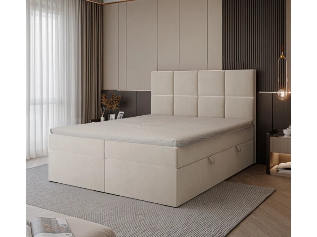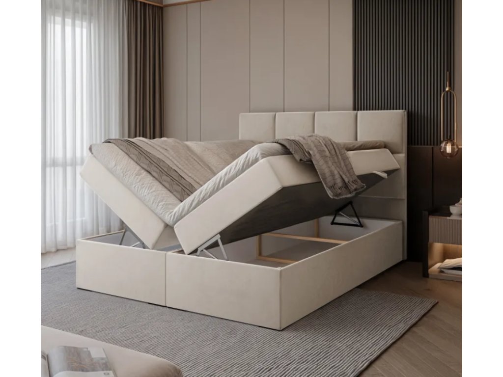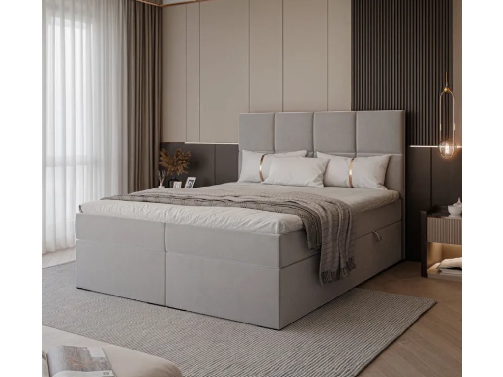 Posteľ má ozdobne prešívané čelo čalúnené mäkkou penou , ktoré nielen dodáva eleganciu, ale poskytuje aj pohodlnú oporu pre večerný relax. Spodná časť postele má dva priestranné úložné priestory s bočnými pántami, ktoré pohodlne uložia náhradné súpravy posteľnej bielizne alebo iné textílie, čím ušetríte miesto.