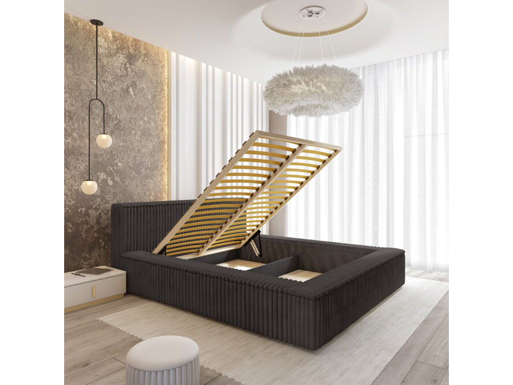 Ďalšou výhodou tejto postele je priestranný kontajner umiestnený pod rámom. Vďaka nej môžete uložiť posteľnú bielizeň, prikrývky a ďalšie predmety, čo je mimoriadne praktické a umožňuje vám ušetriť miesto v spálni.
