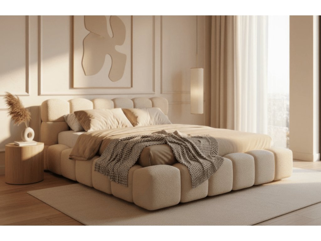 - Moderná čalúnená posteľ s mäkkým čelom pre pohodlné opretie pri čítaní či relaxe.