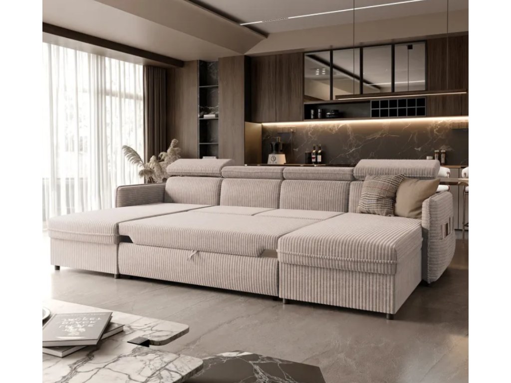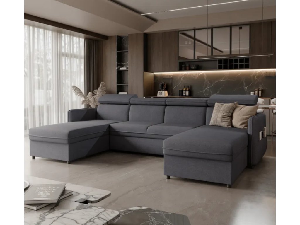 Čalúnená rohová pohovka DEREK s nastaviteľnými opierkami hlavy, funkciou spania a pohodlným sedadlom vystuženým vlnitými pružinami, ako aj praktickým úložným priestorom na knihy v podrúčkach.