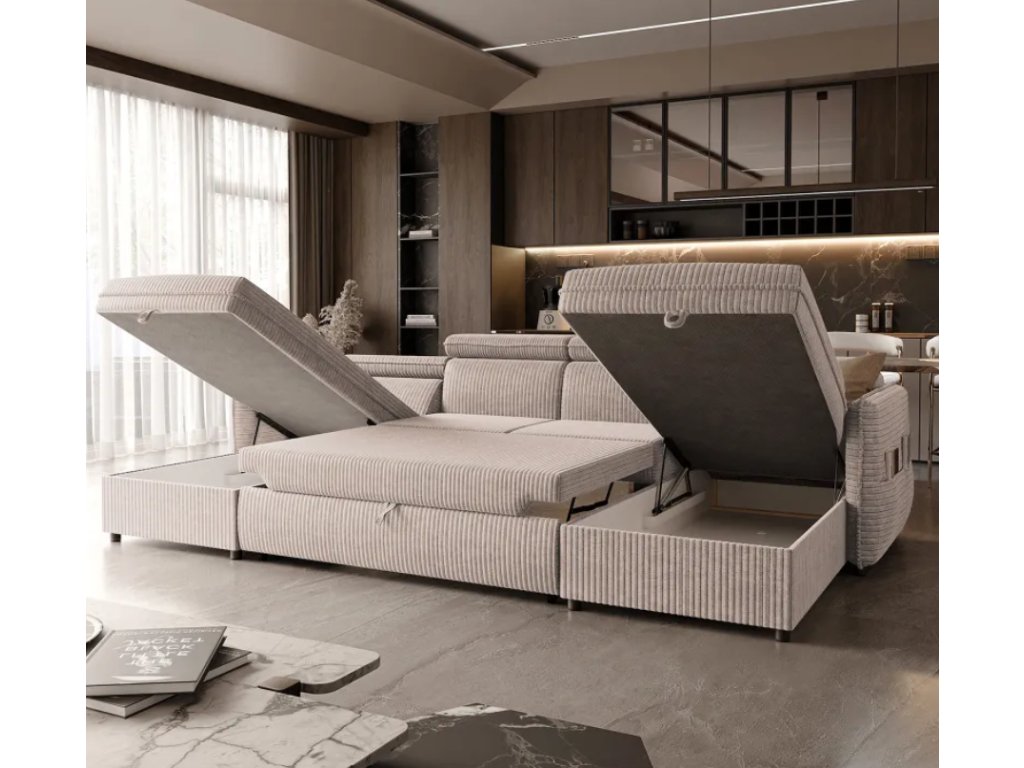 Praktický dizajn rohovej pohovky s dvoma priestrannými úložnými priestormi pod taburetkami zaisťuje pohodlie a uľahčuje organizáciu priestoru. Je to ideálne riešenie pre tých, ktorí si cenia funkčnosť a šikovné úložné riešenia.