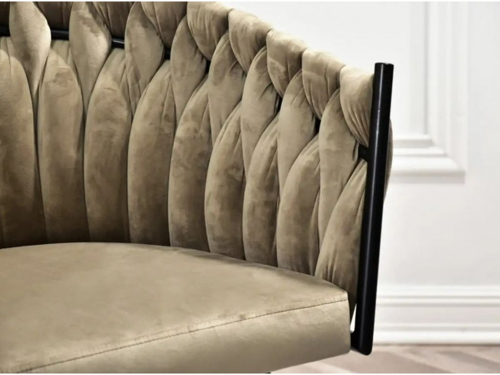 - Elegantná čalúnená stolička EMILY v tmavej béžovej sametovej látke s čiernymi kovovými nožičkami.