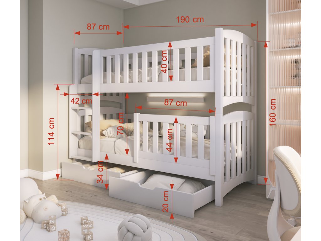 Posteľ RANDALL je praktickým riešením pre súrodencov aj menšie detské izby. Poskytuje dve komfortné lôžka, bezpečnú konštrukciu z masívu a úložné zásuvky, ktoré pomáhajú udržať poriadok. Vďaka pevnej nosnosti a odolnej povrchovej úprave je ideálna na každodenné používanie.