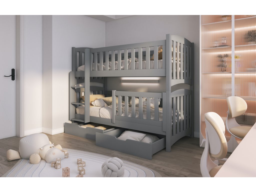 Detská poschodová posteľ RANDALL je pevná a bezpečná posteľ z borovicového masívu s trojvrstvovým lakom vhodným pre deti, doplnená o vystužené bočnice a zábranu na hornom lôžku. Súčasťou sú 2 rošty a 2 priestranné zásuvky.