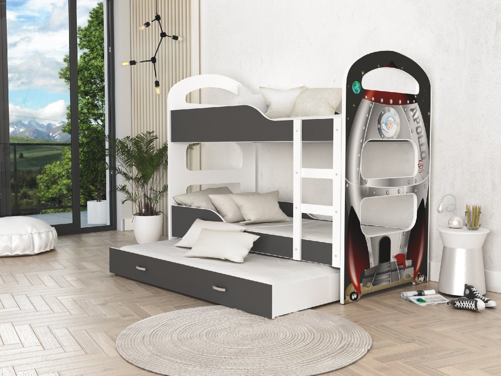 Posteľ disponuje dvomi hlavnými lôžkami nad sebou a praktickou výsuvnou prístelkou, ktorá sa nachádza v spodnej zásuvke. Je to perfektné riešenie pre súrodencov alebo pre príležitostné prespanie kamarátov. Bezpečnosť zaisťujú zaoblené hrany a stabilná konštrukcia s integrovaným rebríkom.