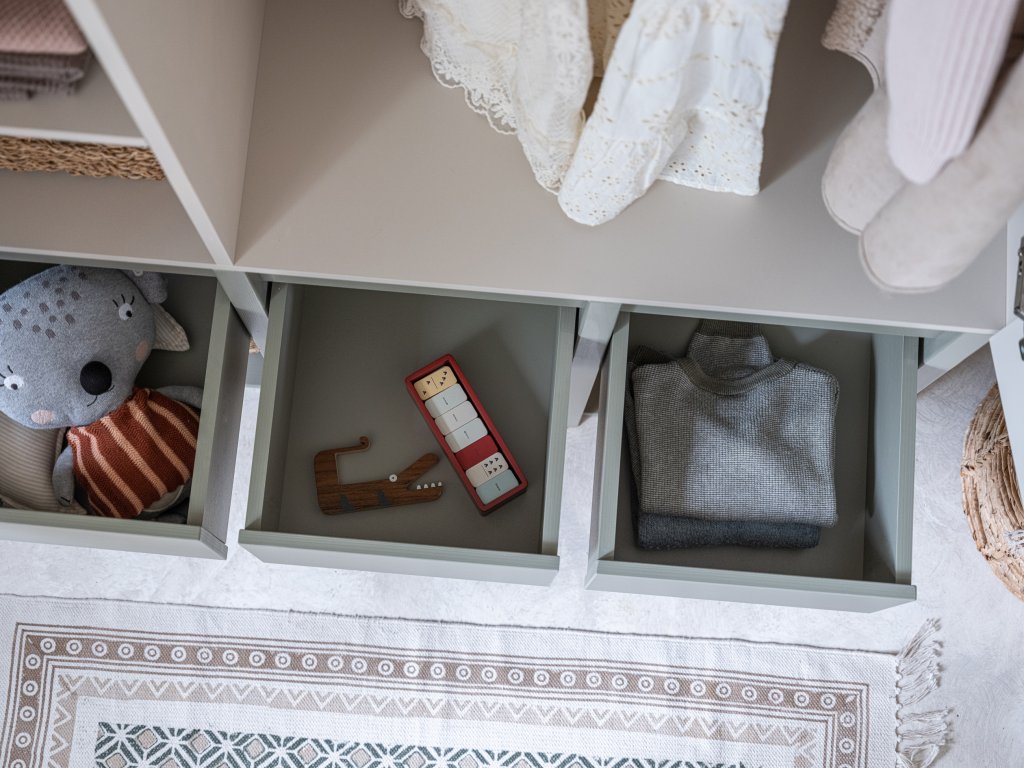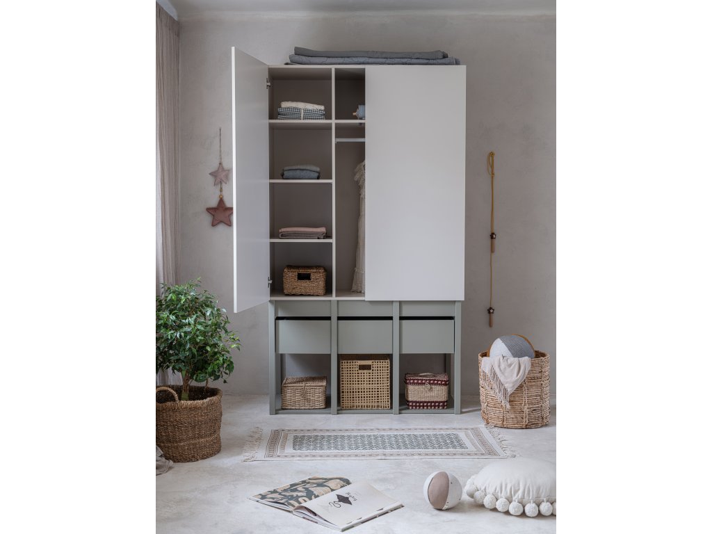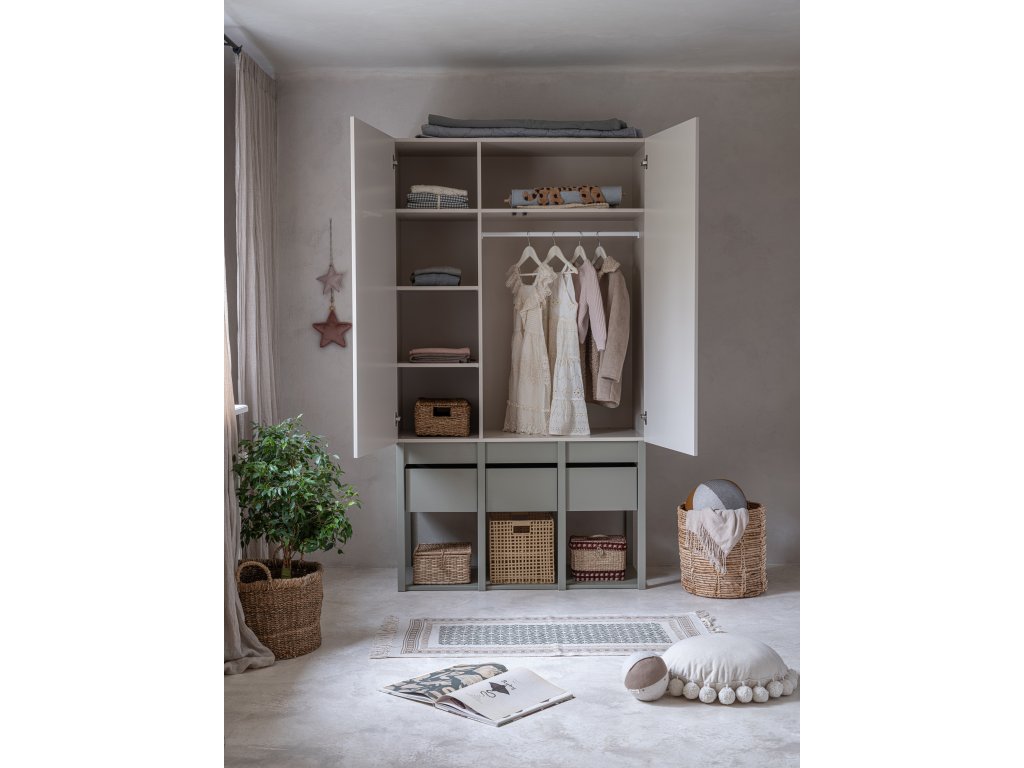 Skriňa má tri samozatváracie zásuvky , ktoré zaisťujú tichý a plynulý chod. V spodnej časti je priestor na tri nádoby na jednoduché uloženie drobných predmetov. Širšia časť skrine je vybavená vešiakmi na šaty a päť ďalších políc ponúka funkčné a flexibilné úložné priestory na oblečenie, doplnky a ďalšie predmety.