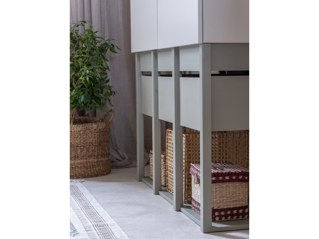 Spodná časť šatníka v jedinečnej eukalyptovej farbe sa dokonale hodí k rôznym aranžmánom a prináša do interiéru sviežosť a eleganciu. Horná časť v odtieni pieskovo béžovej prináša jemné, teplé akcenty.