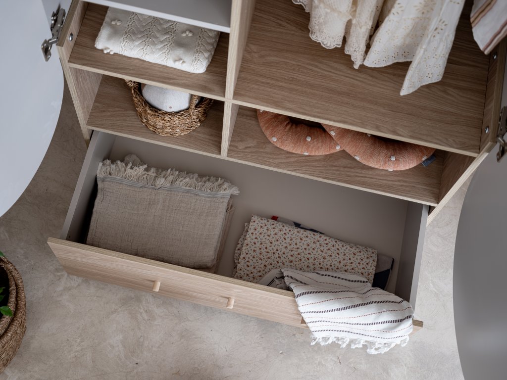 Táto jedinečná skriňa v jemnom kašmírovom odtieni s dubovými detailmi pochádza z novej kolekcie FIONA.