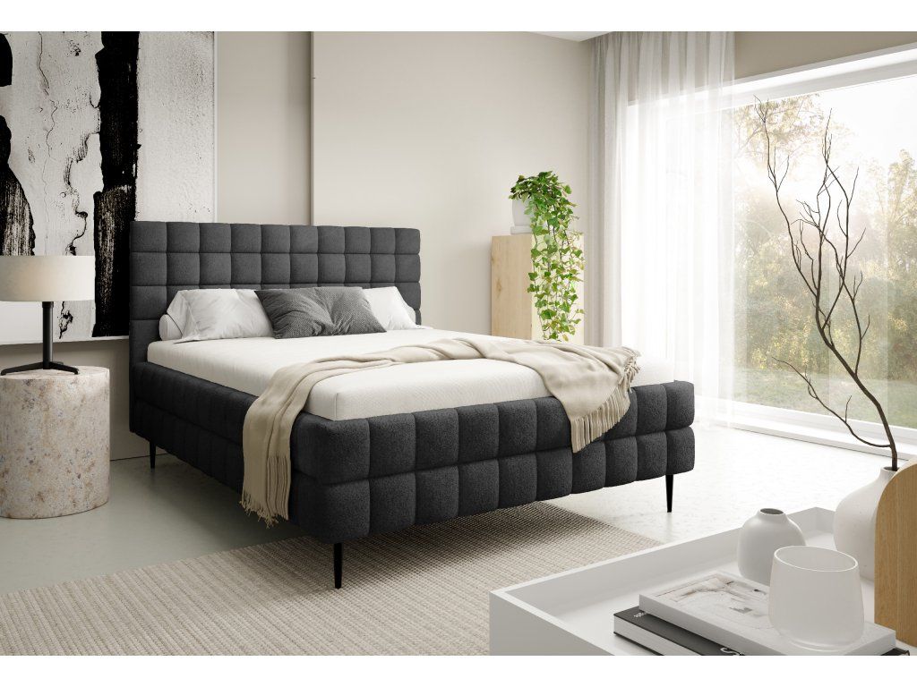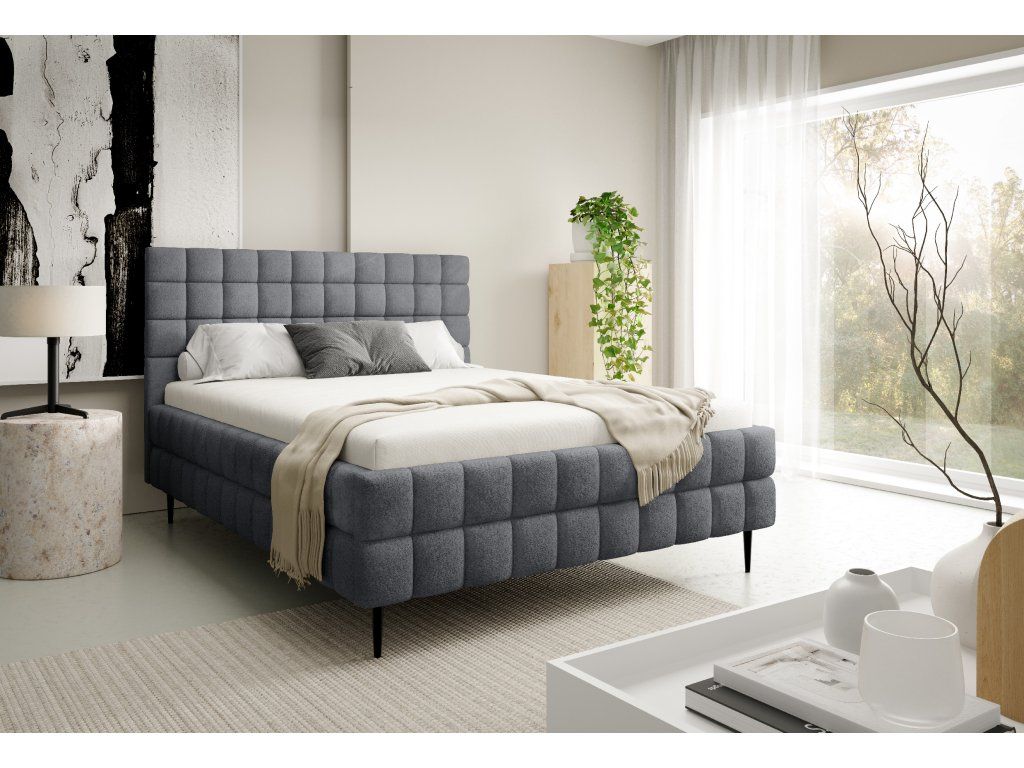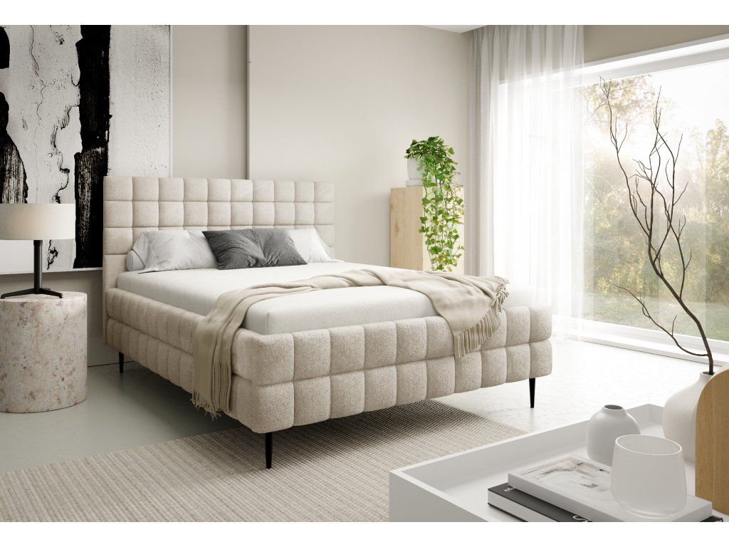 Nadčasový dizajn: Výrazné geometrické prešívanie na čele aj ráme postele pôsobí moderne a zároveň elegantne. Hodí sa do minimalistických, ale aj bohatšie zariadených spální.