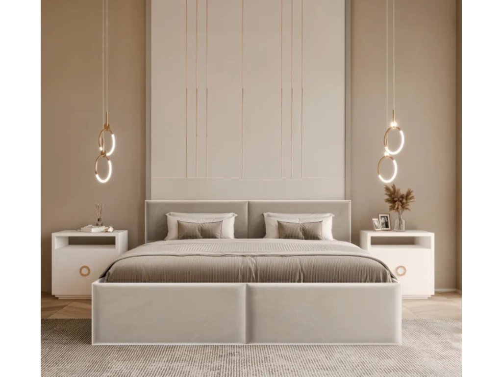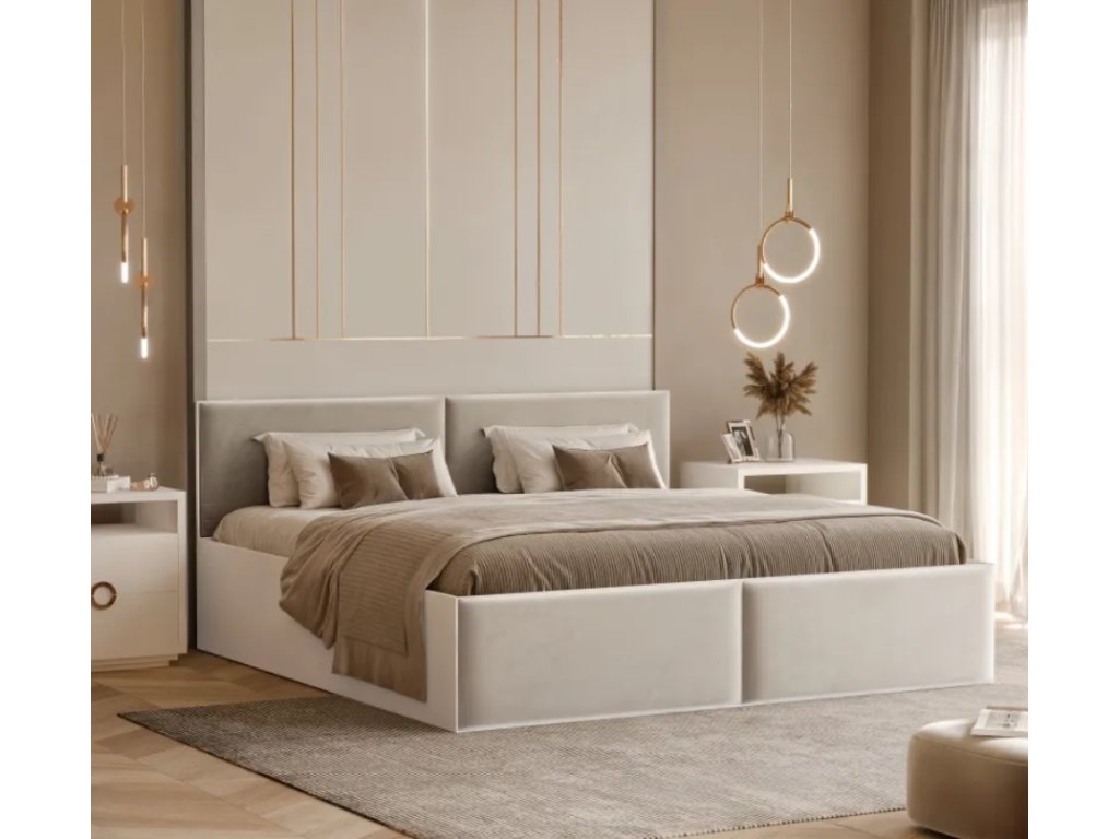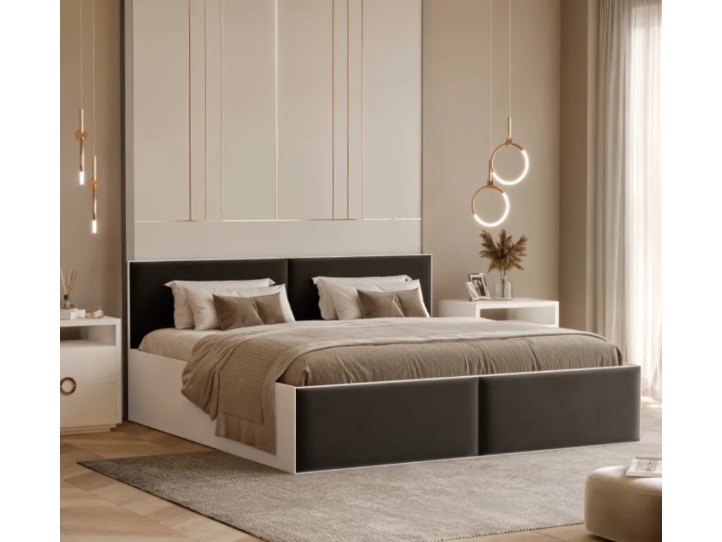 Posteľ KENDRICK sa vyznačuje moderným dizajnom a pohodlím a je dostupná v dvoch veľkostiach. Praktické vrecko na posteľnú bielizeň a čalúnené panely v troch elegantných farbách z nej robia dokonalú kombináciu funkčnosti a estetiky.