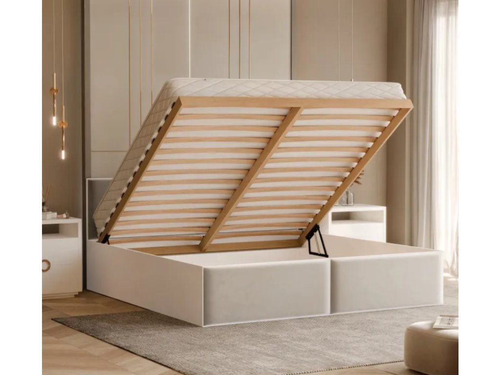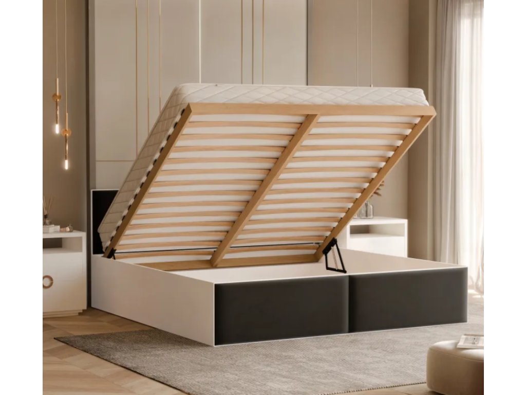 Funkčnosť je jeho silnou stránkou. Vstavaná, priestranná priehradka na posteľnú bielizeň uľahčuje udržiavanie poriadku a uskladnenie prebytočných textílií alebo sezónneho oblečenia. Priehradka je rozdelená na dve časti, čo umožňuje lepšiu organizáciu uložených vecí. Zdvíhanie rámu je bezproblémové a jednoduché vďaka pružinovému mechanizmu a drevenému rámu s rukoväťou – každodenné používanie je rýchle a pohodlné.