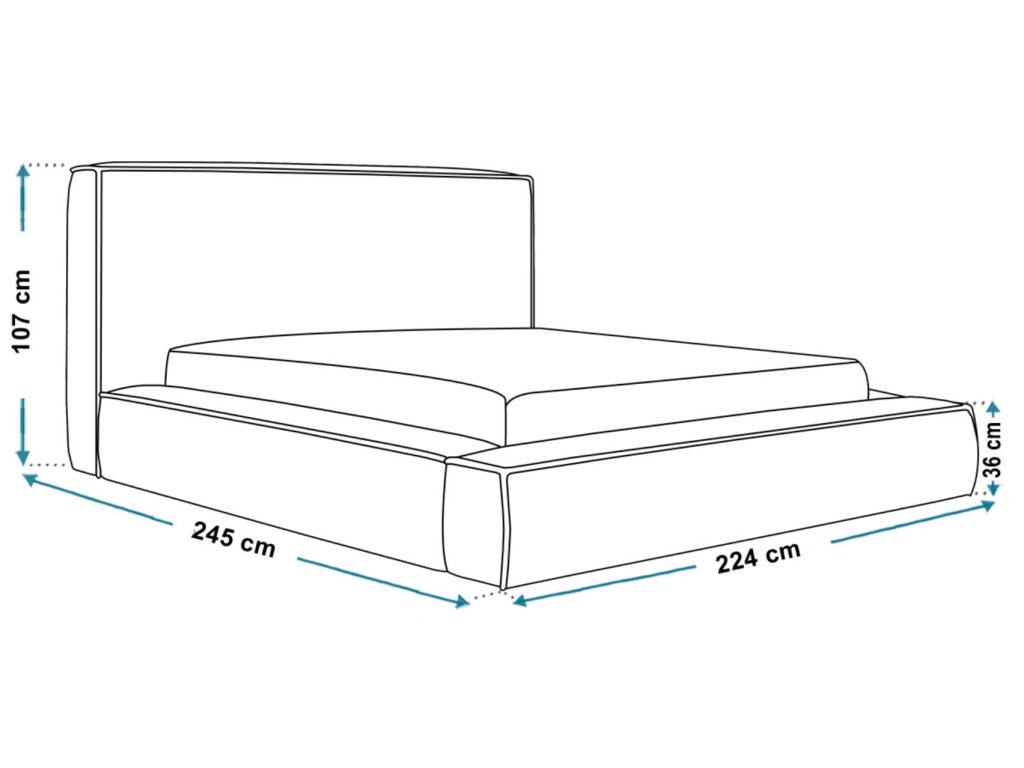 To, čo robí túto posteľ výnimočnou, sú jej veľkorysé vonkajšie rozmery. Široký čalúnený rám (celková šírka 184 cm a dĺžka 245 cm) vytvára efekt luxusného ostrova pohodlia a zároveň chráni pred tvrdými nárazmi. Robustná konštrukcia s výškou rámu 36 cm zaručuje stabilitu a moderný, nízky profil, ktorý opticky nezaťaží priestor, no dodá mu charakter.