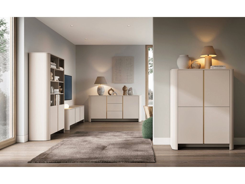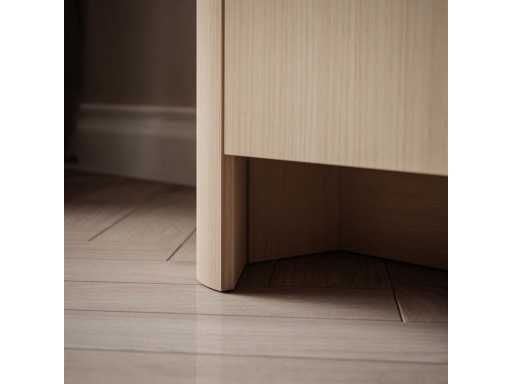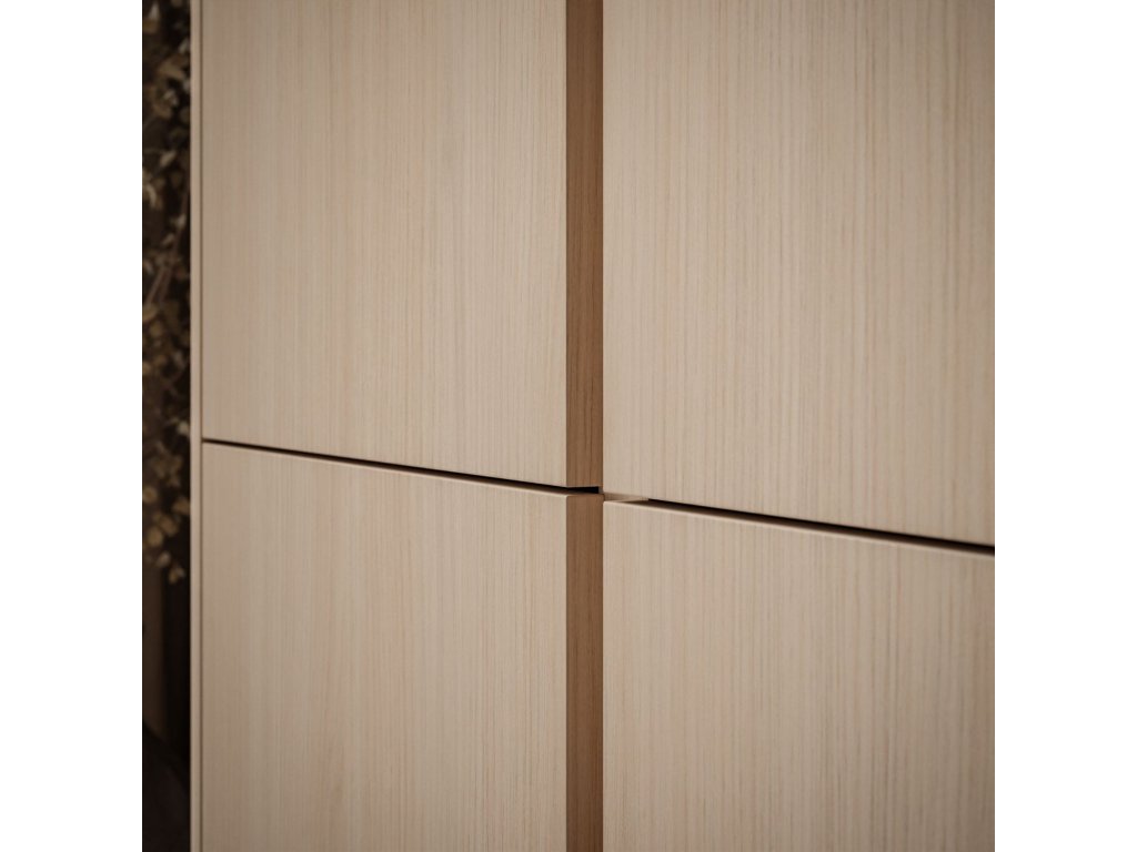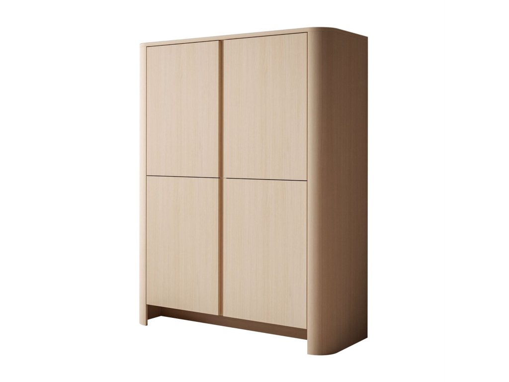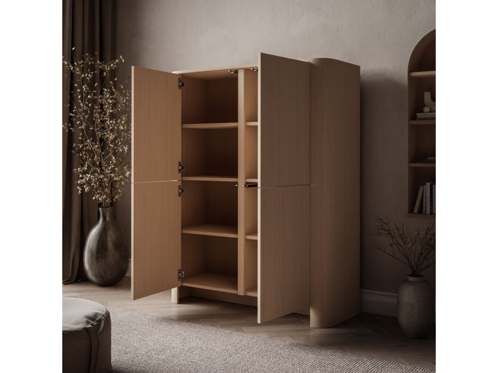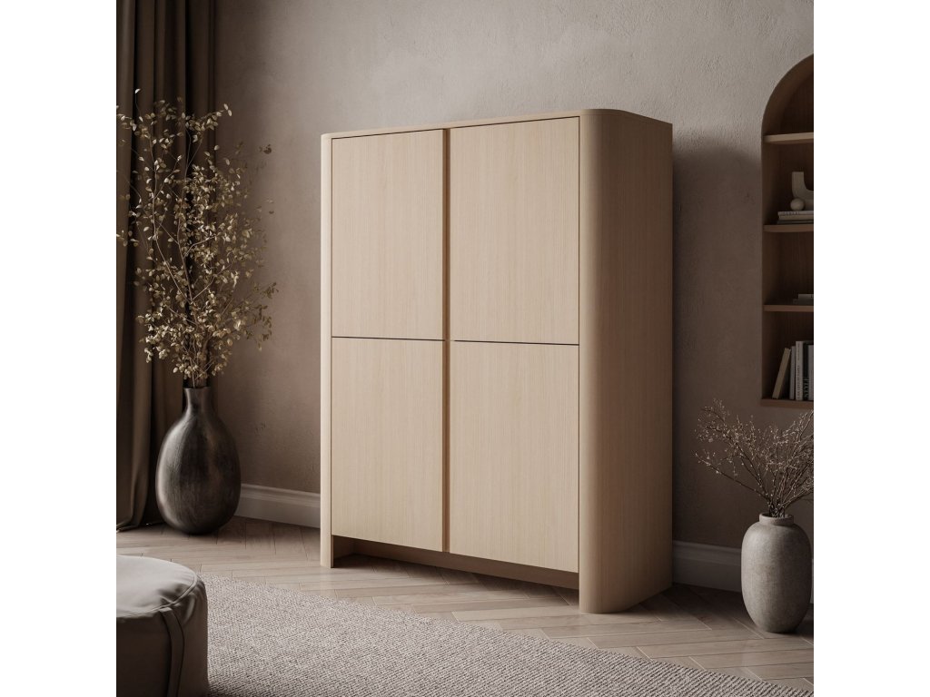 Dubová komoda HARLEM je moderný, funkčný kus nábytku so štyrmi čelami a praktickými policami, ktorý kombinuje estetiku s pohodlným úložným priestorom v rôznych interiéroch.