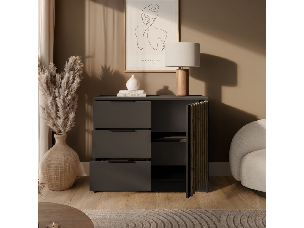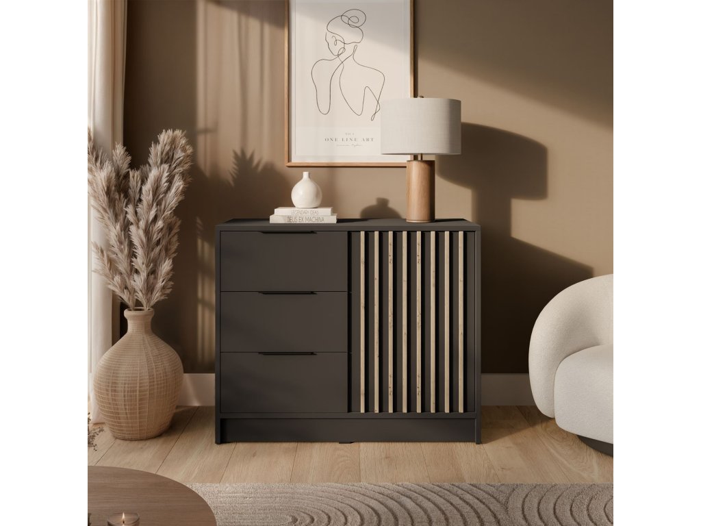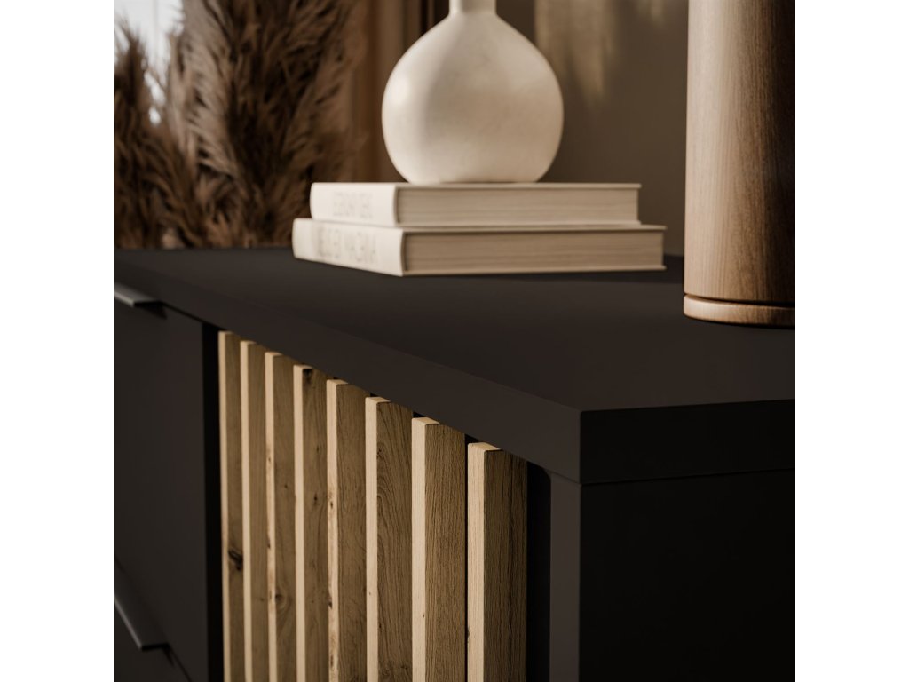 Komoda Jona je perfektným riešením pre tých, ktorí hľadajú štýlový a funkčný úložný priestor. Vďaka modernému dizajnu s lamelami a premyslenému vnútornému usporiadaniu prináša eleganciu a poriadok do každej miestnosti.