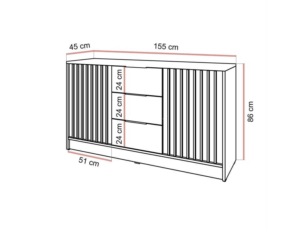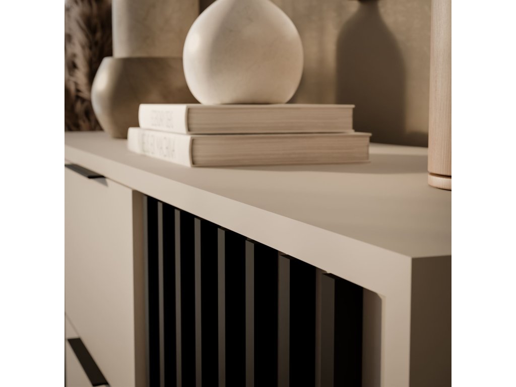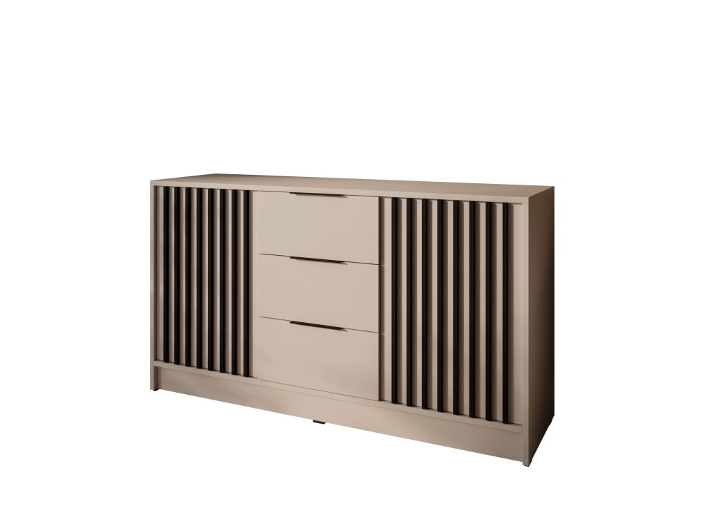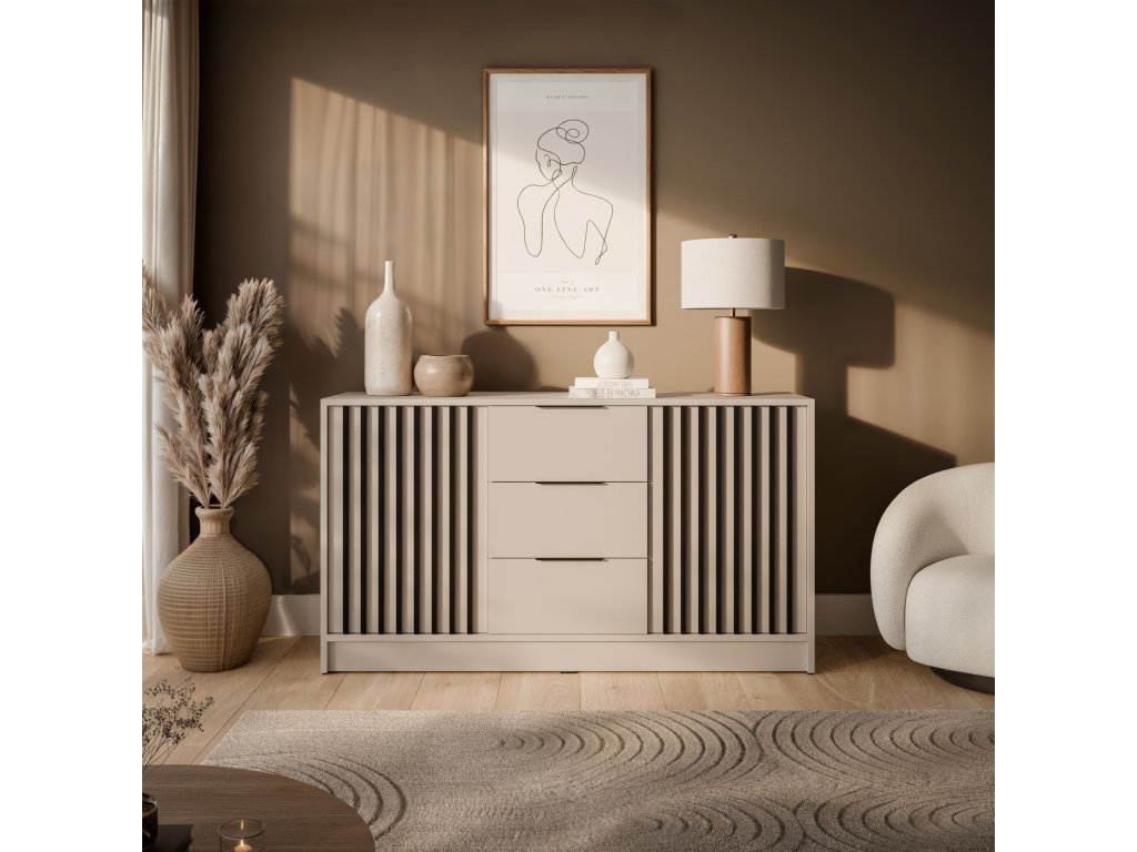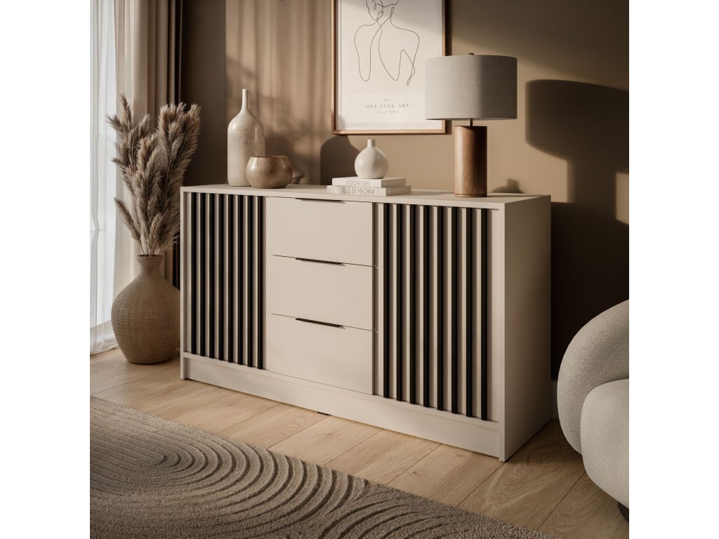 Komoda Jona je perfektným riešením pre tých, ktorí potrebujú viac úložného priestoru bez toho, aby obetovali štýlový vzhľad. Moderný dizajn s lamelami a praktické usporiadanie so zásuvkami a skrinkou robia z tohto kusu nábytku ideálny kus pre akékoľvek usporiadanie.