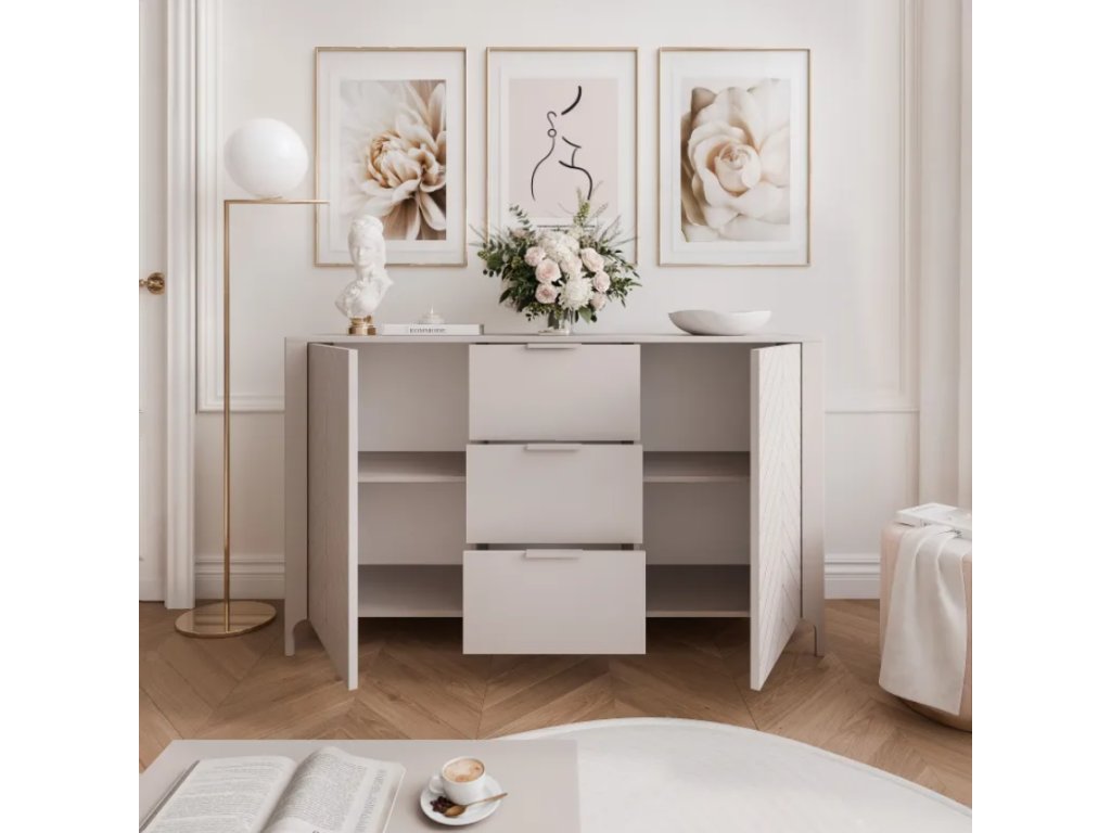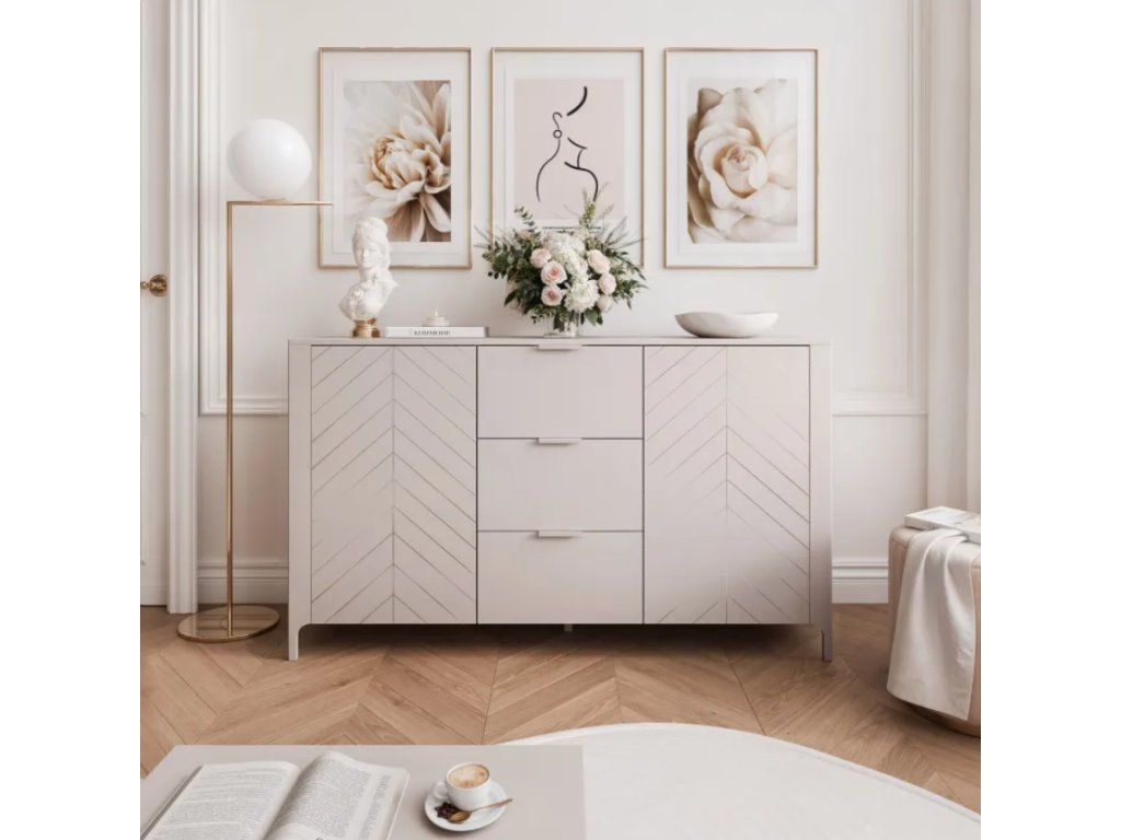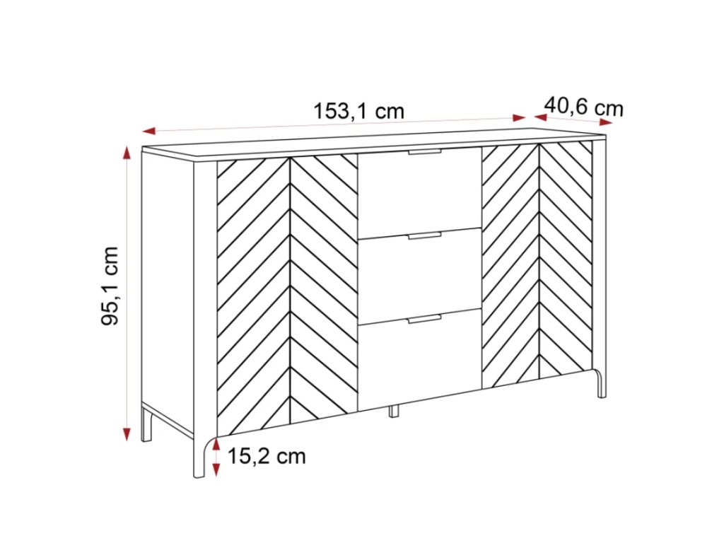 Komoda z kolekcie MARCIUS je kombináciou moderného dizajnu, funkčnosti a jedinečných detailov, ako sú predné strany so vzorom rybej kosti a kovové úchytky, vďaka ktorým sa perfektne hodí do každého interiéru.
