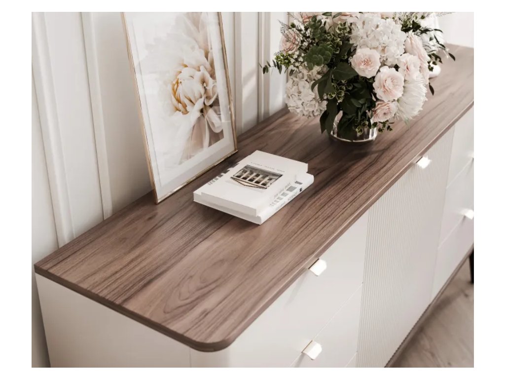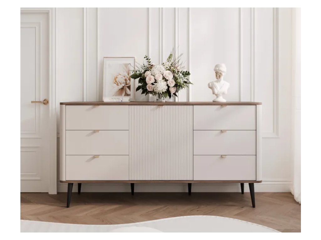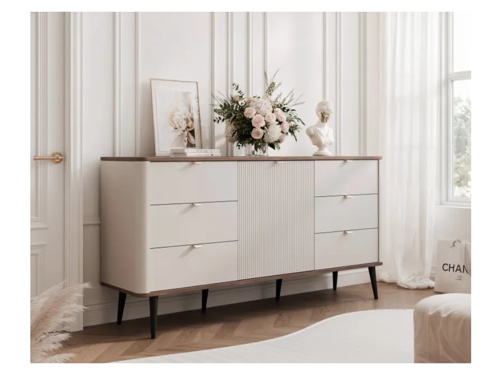 Komoda z kolekcie NICOLA je štýlovým a praktickým riešením pre každý interiér. Vďaka šiestim priestranným zásuvkám a vnútorným policiam poskytuje dostatok úložného priestoru a jednoduchú organizáciu predmetov dennej potreby. Jeho kašmírové, drážkované predné časti dodávajú nábytku elegantný vzhľad a moderný systém tichého zatvárania zvyšuje pohodlie používania a zaručuje plynulé a tiché zatváranie.