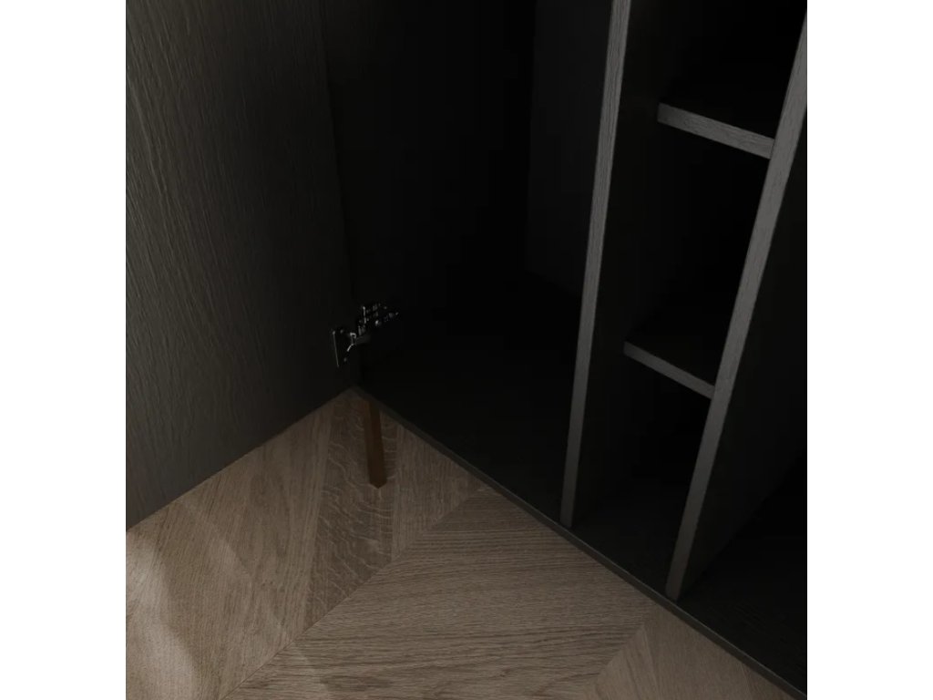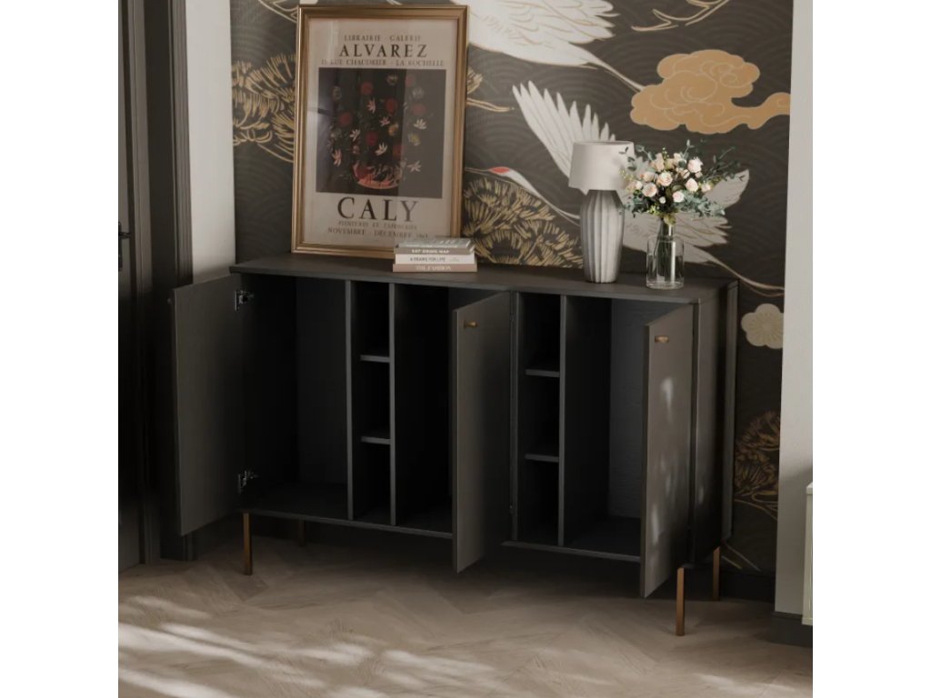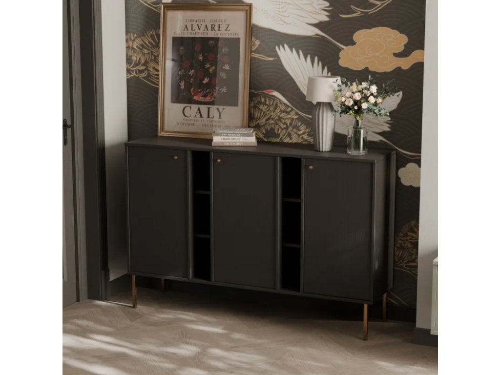 Tri priestranné priehradky poskytujú dostatok úložného priestoru, od textílií a dokumentov až po riad a každodenné potreby. To pomáha udržiavať poriadok a zároveň skrýva veci, ktoré nemusia byť vystavené. Medzi čelami sú tiež úzke , otvorené police , ideálne na dekorácie, knihy alebo drobné predmety, ku ktorým chcete mať rýchly prístup. Toto riešenie narúša symetriu nábytku a dodáva mu nádych ľahkosti a funkčnosti.
