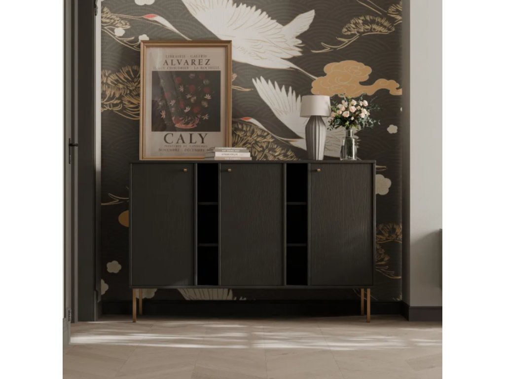 Táto trojdverová komoda, inšpirovaná japonským minimalizmom a dostupná v troch farbách, poteší svojou jednoduchou formou a decentnou povrchovou úpravou, čím do interiéru vnáša harmóniu a eleganciu.