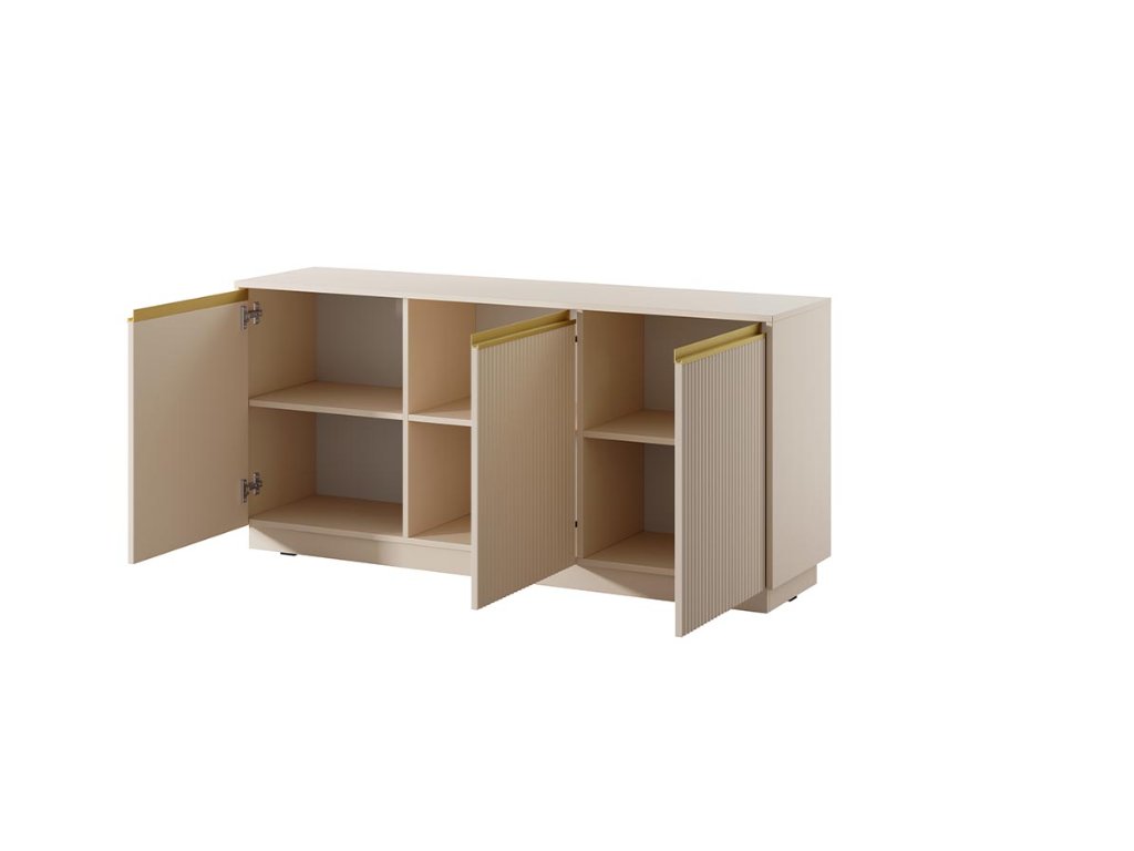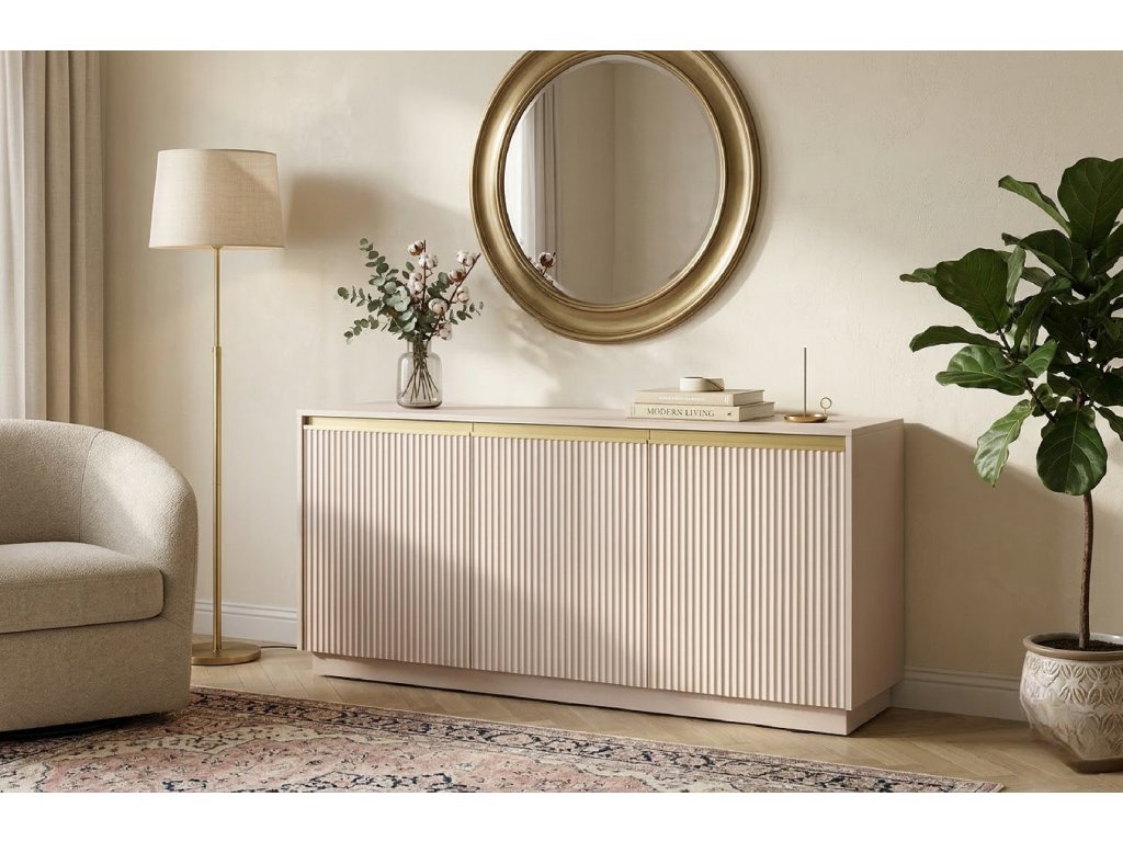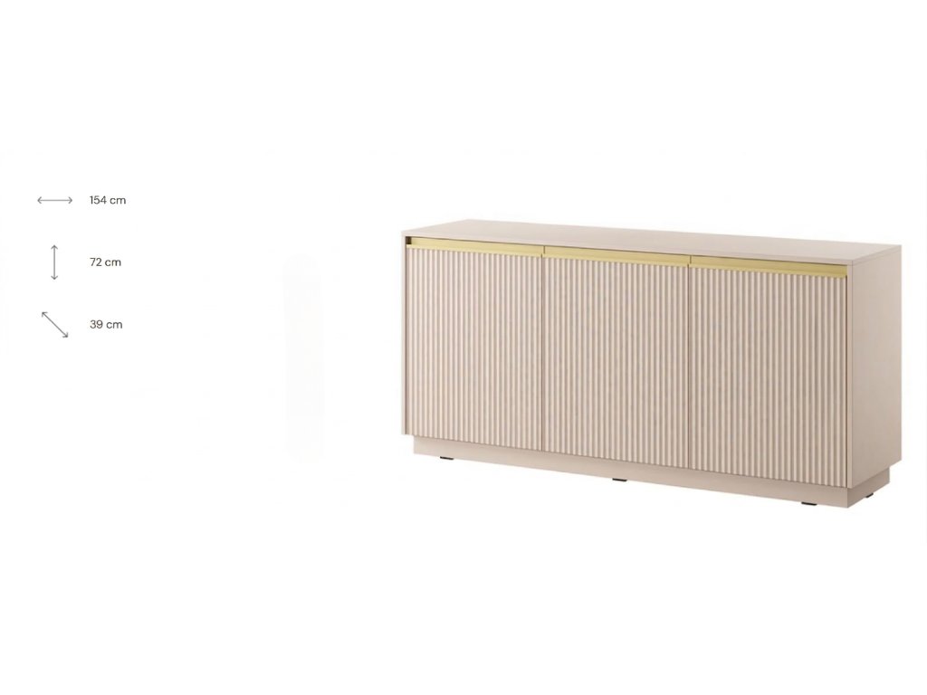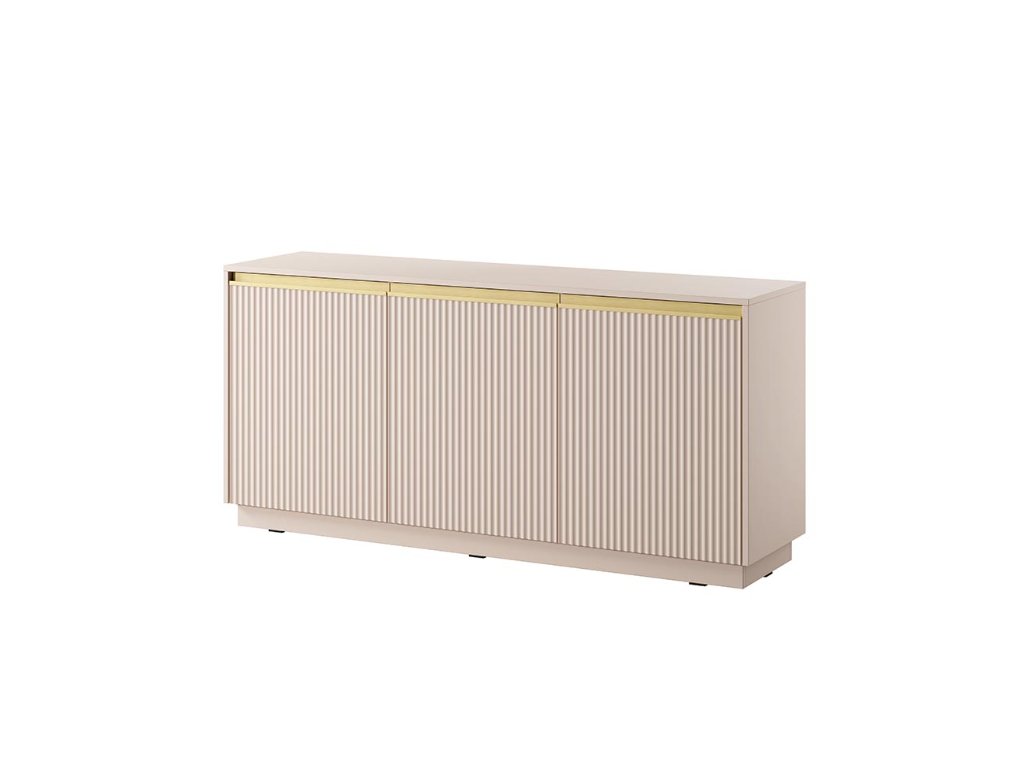 Dodajte svojmu interiéru nádych moderného luxusu a jemnosti. Táto štýlová komoda v nádhernom béžovom odtieni je dokonalou kombináciou funkčnosti a špičkového dizajnu. Jej dominantným prvkom sú vertikálne lamelové čelá, ktoré vytvárajú zaujímavú hru svetla a tieňa, čím dodávajú priestoru hĺbku a dynamiku.