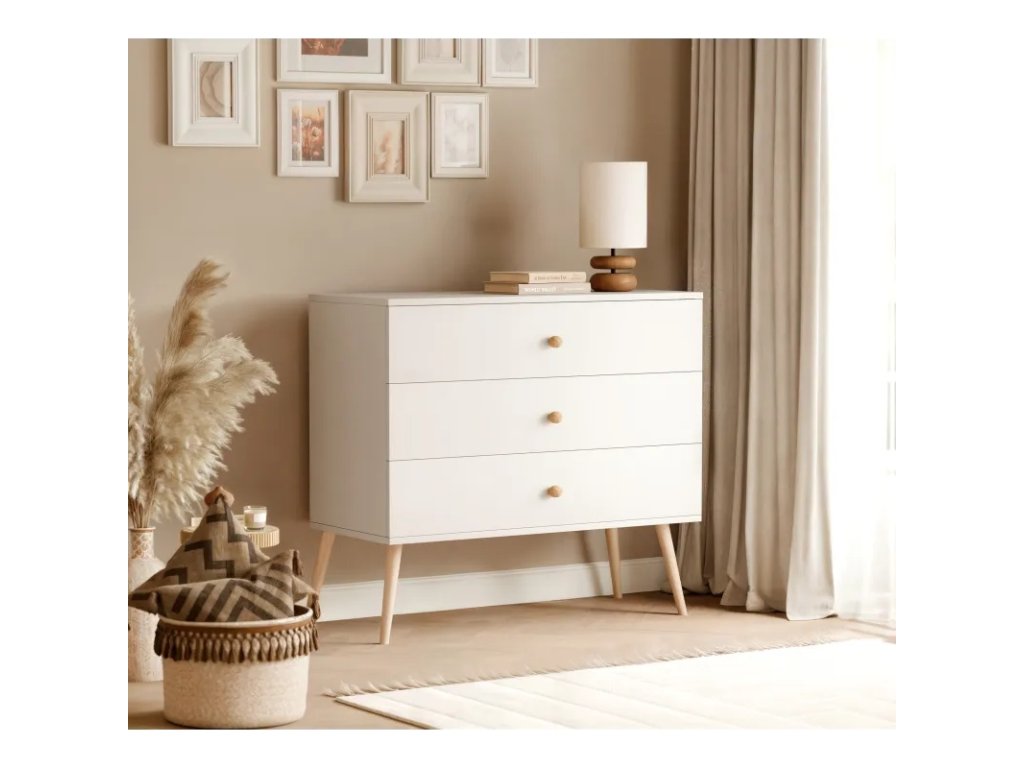 Komoda VALERIA je dostupná v módnych pastelových farbách , vďaka čomu sa hodí do každého interiéru – od svetlých, minimalistických priestorov až po izby zariadené v boho alebo škandinávskom štýle. Nohy z masívneho dreva dopĺňajú dizajn, dodávajú jej ľahký vzhľad a zároveň zaisťujú stabilitu.