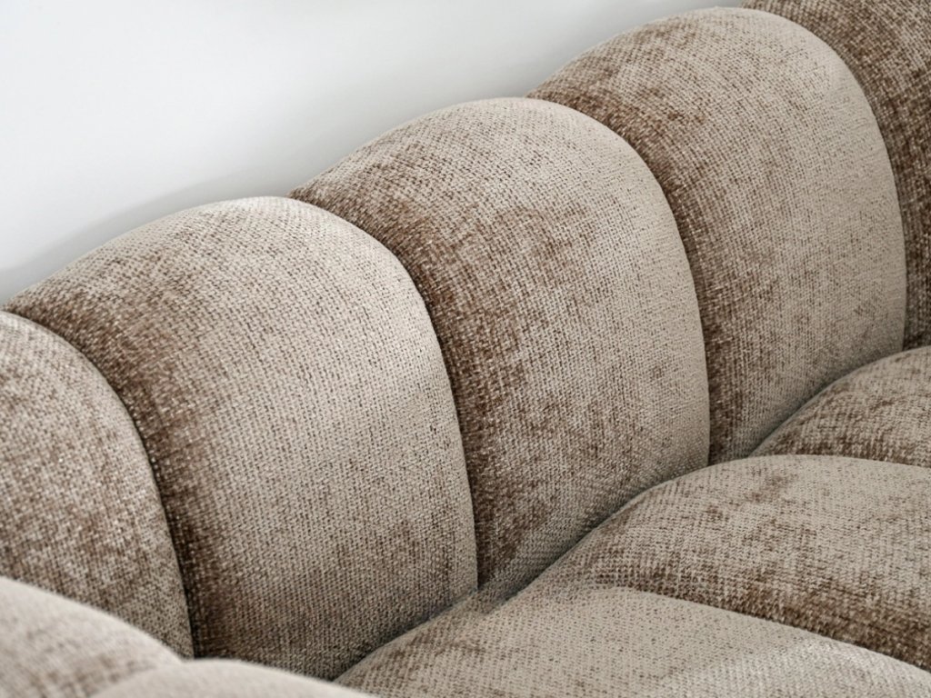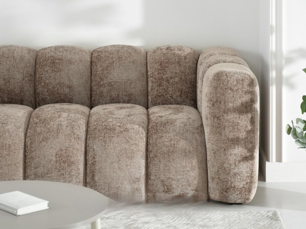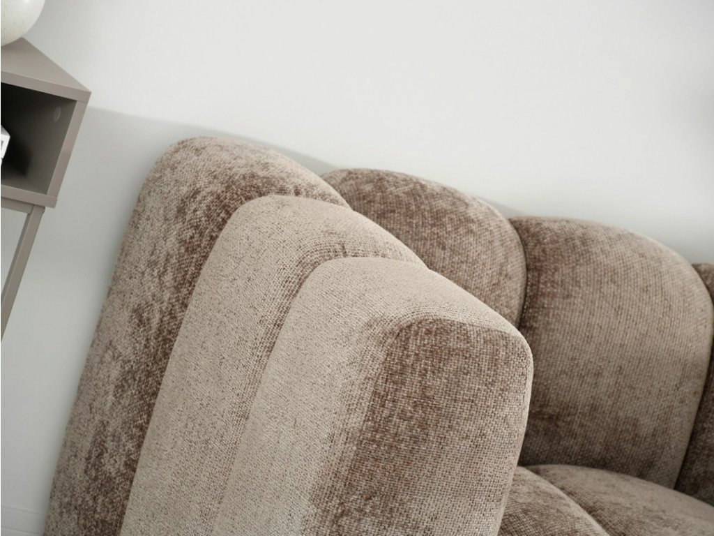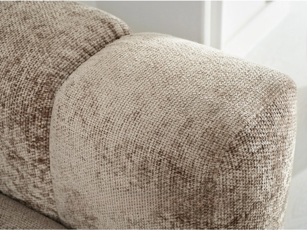Čalúnenie pohovky GUNNER je vyrobené z hnedej štrukturálnej látky zo ženilkových priadzí, ktorá poteší nielen svojou farbou, ale aj výraznou textúrou. Ženilková priadza dodáva látke hĺbku a jemné tieňovanie, čo dodáva pohovke eleganciu a dodáva jej výnimočne vznešený vzhľad. Hnedá farba zatepluje interiér a vnáša doň útulnú, prirodzenú atmosféru. Ženilkový efekt dodáva pohovke mierne lesklý efekt, ktorý oživuje jednotnú farbu a dodáva pohovke elegantný vzhľad.