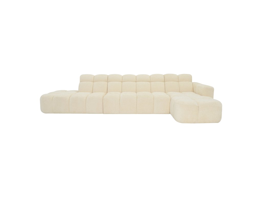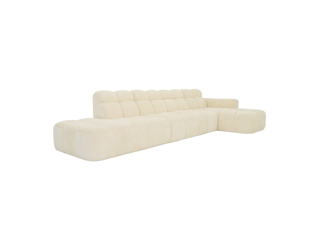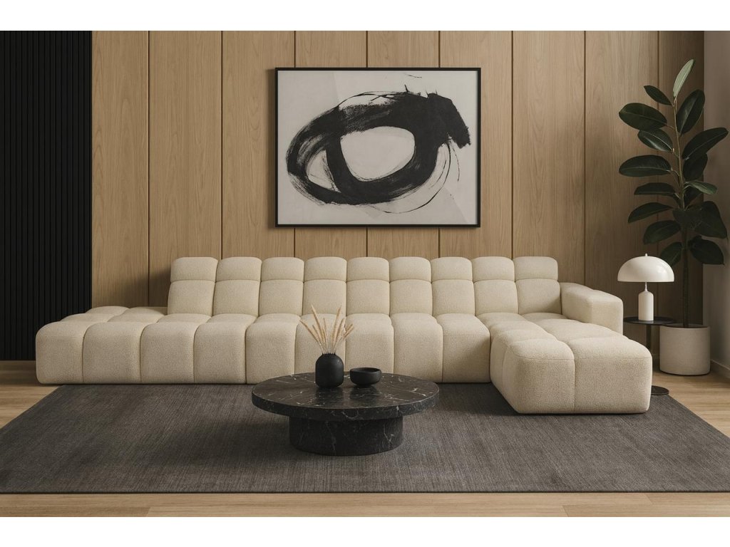 Dizajnová rohová sedačka LISABON spája minimalistický vzhľad s maximálnym pohodlím. Jej modulárna konštrukcia umožňuje prispôsobiť tvar priestoru, zatiaľ čo jemná béžová poťahová látka s štruktúrou boucle dodáva interiéru eleganciu a teplo. Charakteristické bublinové prešívanie vytvára originálny 3D efekt, ktorý zaujme na prvý pohľad.