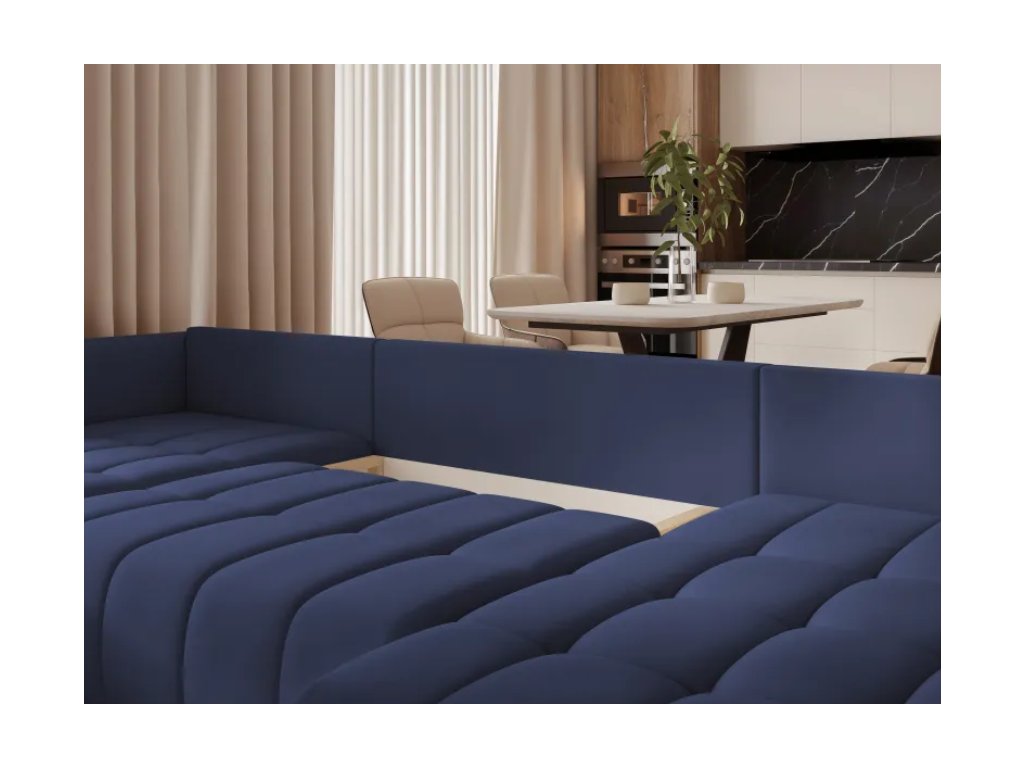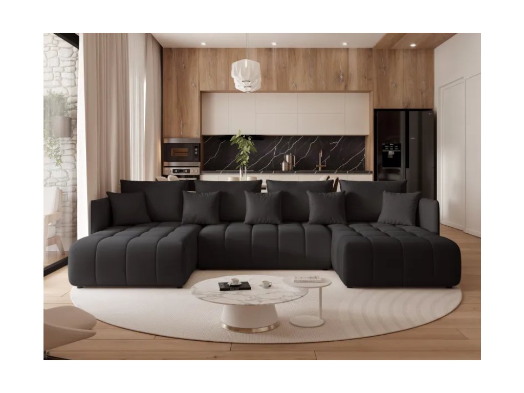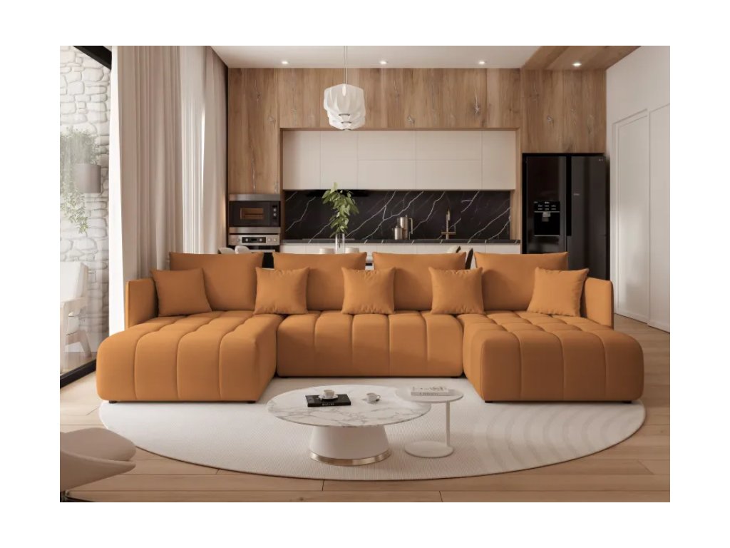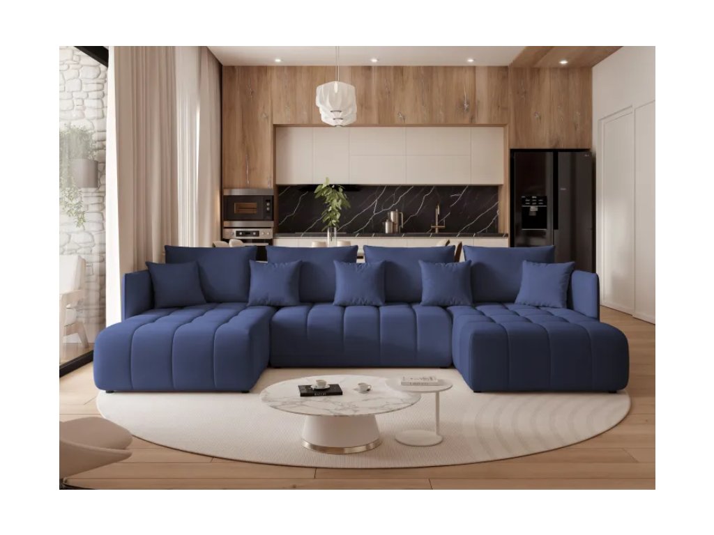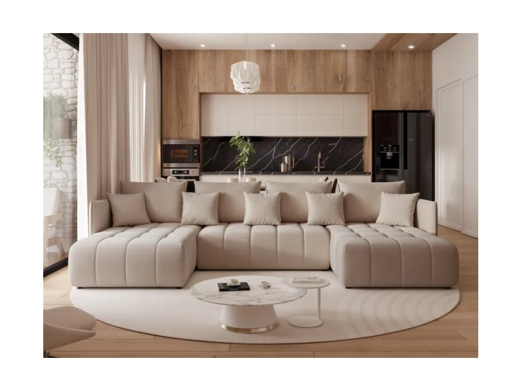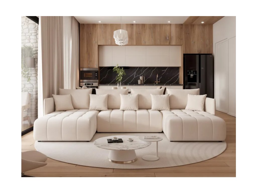 Čalúnená rohová pohovka ZANDEN U s funkciou spania je moderný a priestranný kus nábytku v tvare U, ktorý poskytuje vysoký komfort pre každodenný relax a pohodlné miesto na spanie.