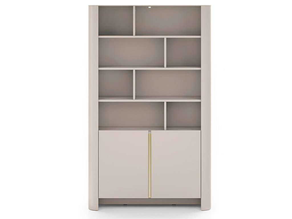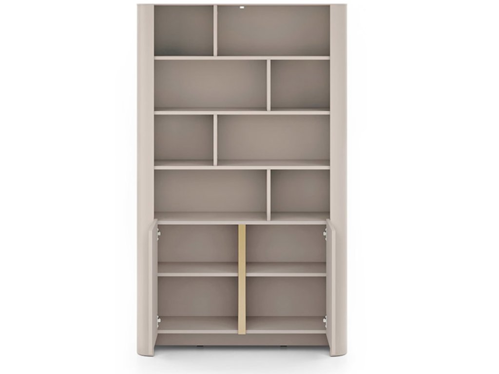 Vysoká vitrína v elegantnom kašmírovom odtieni (jemná kombinácia béžovej a sivej) pôsobí moderne a zároveň nadčasovo.