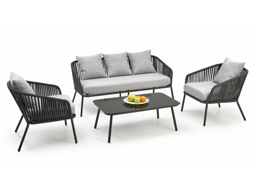 • Skladá sa z lavice, dvoch stoličiek a konferenčného stolíka, ktoré sú harmonicky kombinované v príjemných odtieňoch tmavo sivej a svetlo sivej farbe.