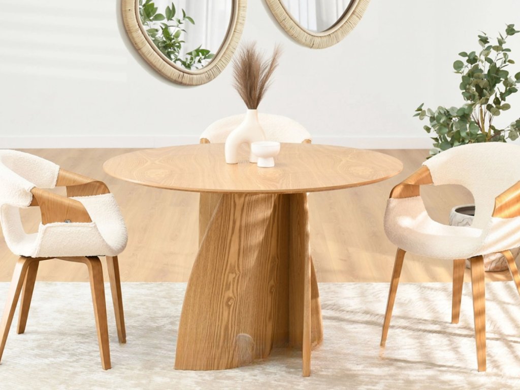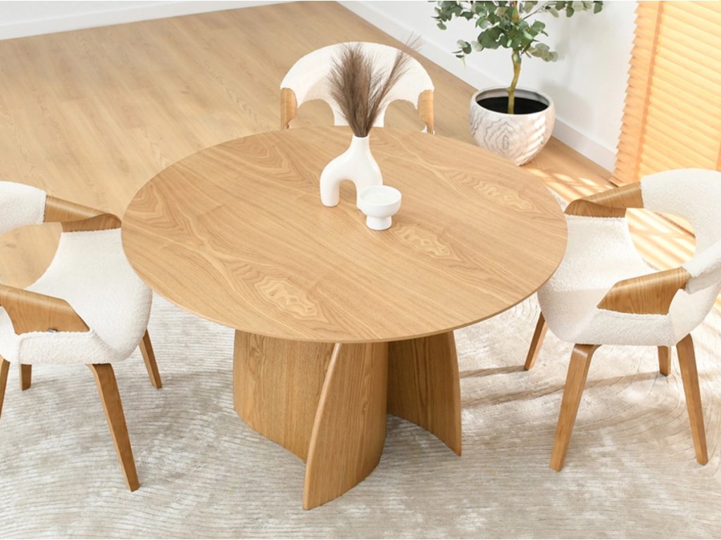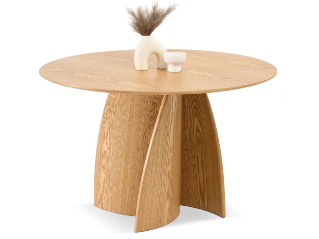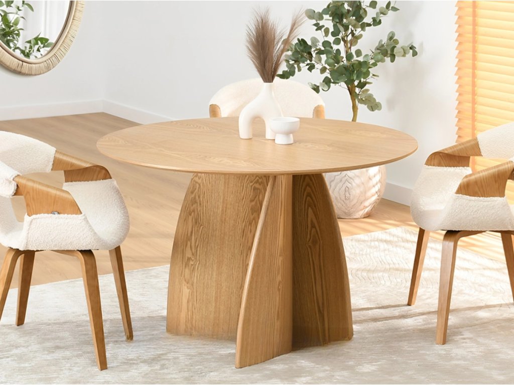 Okrúhly, dyhovaný stôl ALIJAH je štýlový a funkčný kus nábytku, ktorý sa bude perfektne hodiť do jedálne, kuchyne alebo malej konferenčnej miestnosti.