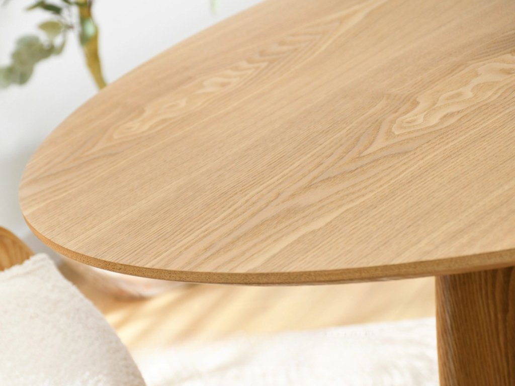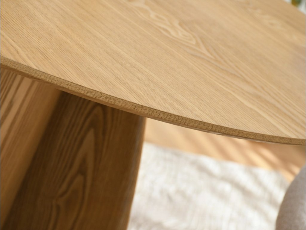 Okrúhly stôl ALIJAH poteší svojimi teplými a prírodnými dubovými farbami, ktoré dodávajú útulný charakter každému interiéru. Dyhovaná doska má výraznú textúru, ktorá zdôrazňuje štýl nábytku. Farby stola dokonale ladia s rozmanitou paletou farieb, od svetlých odtieňov až po tmavšie.