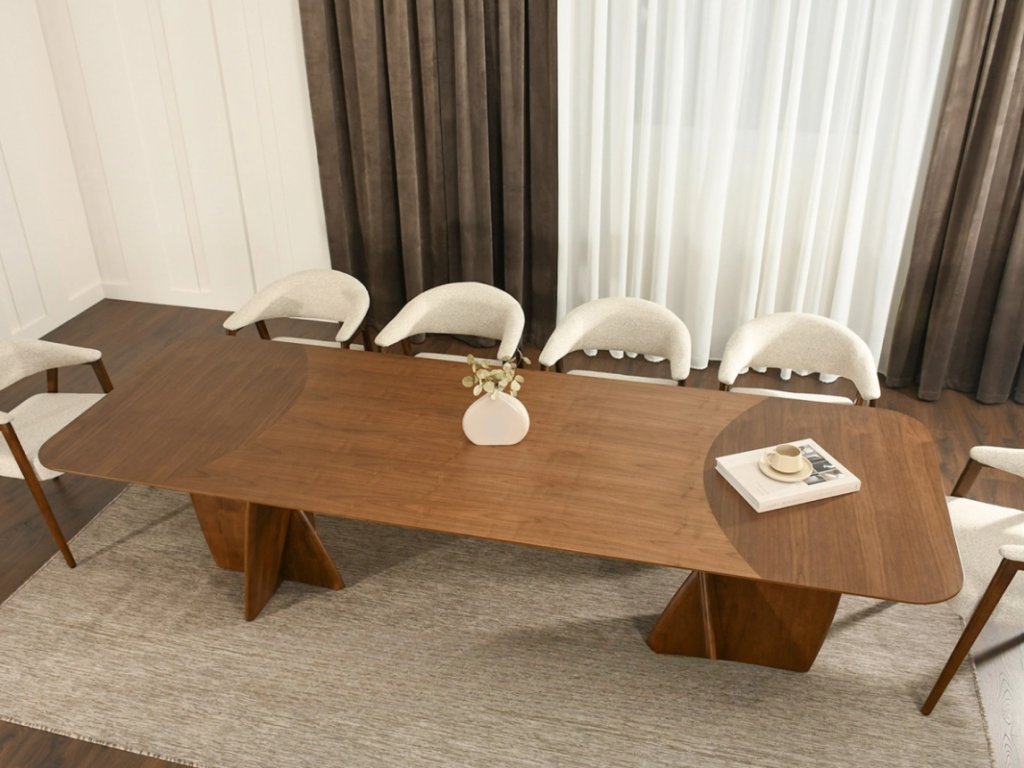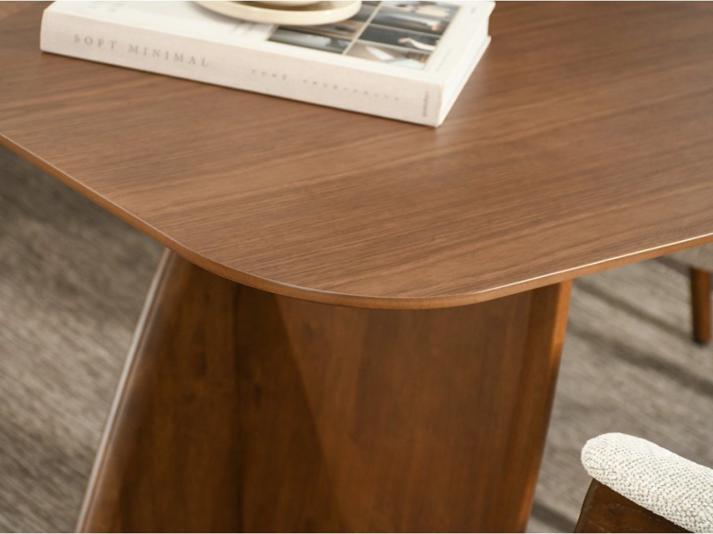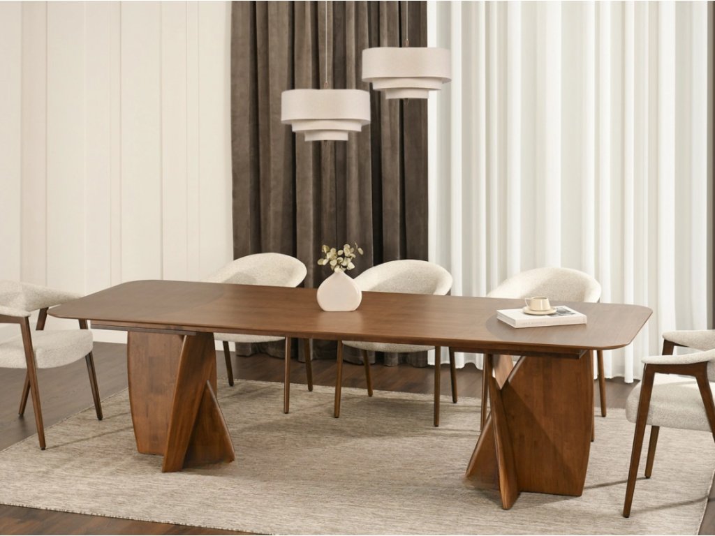 Stôl LINEA je stelesnením moderného, industriálneho štýlu a dokonale sa hodí do jedální, obývacích izieb a komerčných priestorov. Jeho geometrický, sochársky podstavec, inšpirovaný prírodou, je jedinečným detailom, ktorý púta pozornosť a dodáva interiéru charakter. Kombinácia teplej orechovej farby a minimalistického tvaru umožňuje stolu ľahko sa hodiť k rôznym druhom nábytku a doplnkom – od kožených kresiel až po textílie v tlmených tónoch. Vytvorte útulný a elegantný priestor, ktorý poteší každého hosťa.