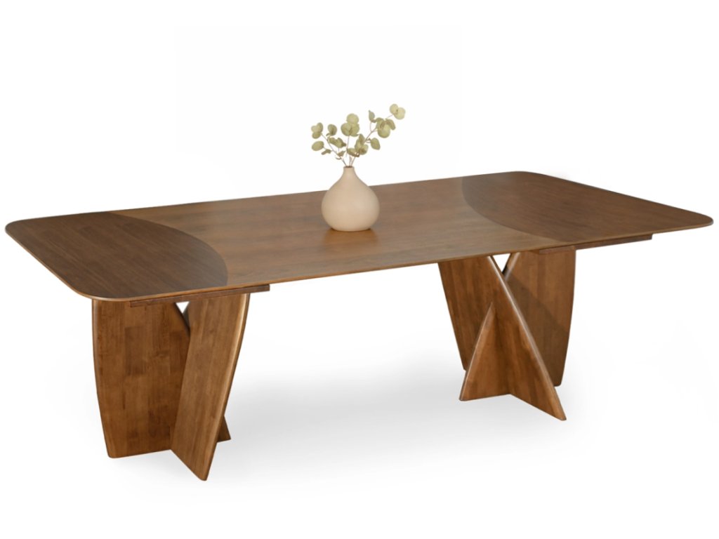 zaujme svojou odolnosťou a prirodzenou krásou. Doska stola je potiahnutá starostlivo vybranou dyhovanou preglejkou, ktorá zvýrazňuje charakteristickú štruktúru dreva a zároveň zaisťuje odolnosť a estetickú príťažlivosť. Geometrická základňa z exotického dreva nielenže dodáva kusu nábytku jedinečný štýl, ale zaisťuje aj štrukturálnu pevnosť. Doska stola má na okrajoch jemné podrezania, ktoré jej dodávajú ľahký a vizuálne príťažlivý vzhľad. Vďaka použitiu moderných technológií povrchovej úpravy je stôl odolný voči každodennému používaniu a zachová si svoj lesk po mnoho rokov.