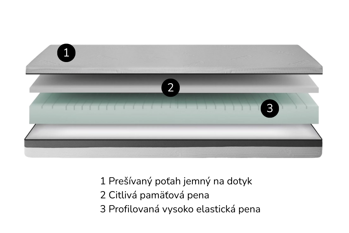 - Kombinuje profilovanú HR penu 18 cm pre pružnosť a odolnosť s 3 cm vrstvou visco (memory) peny pre komfort a uvoľnenie tlaku.