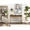 Písací stôl s orechovou doskou, dvoma zásuvkami a zlatým rámom zapadá do moderného štýlu s prvkami elegancie. Jeho jednoduchá forma a rafinované detaily dodávajú interiéru jedinečný charakter. Orechový vrch dodáva teplo a prirodzenosť, zatiaľ čo zlatý rám mu dodáva jemný lesk a luxusný povrch. Tento písací stôl sa perfektne hodí do moderných aranžmánov a dodáva mu nádych štýlu a prestíže.