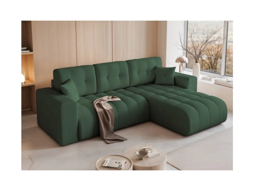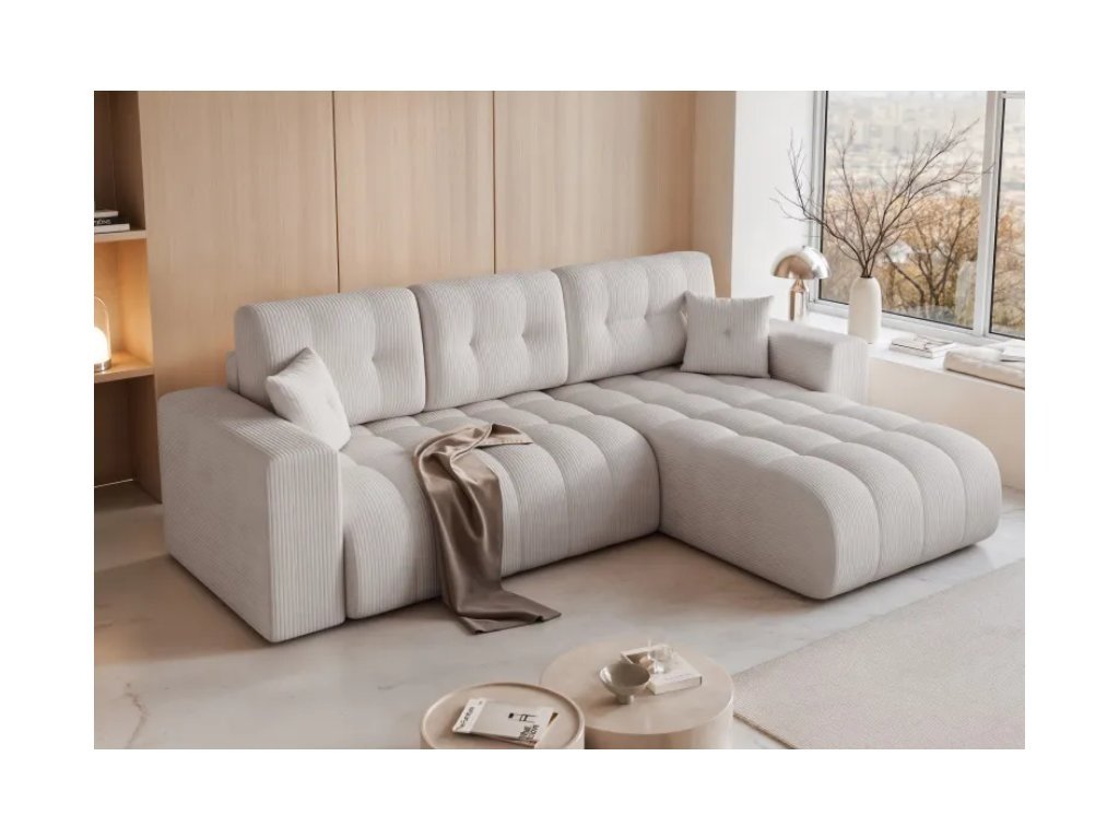 Štýlová čalúnená rohová pohovka s funkciou spania a úložným priestorom na posteľnú bielizeň, ktorá sa vďaka univerzálnemu nastaveniu a možnostiam látok perfektne hodí do modernej obývačky.