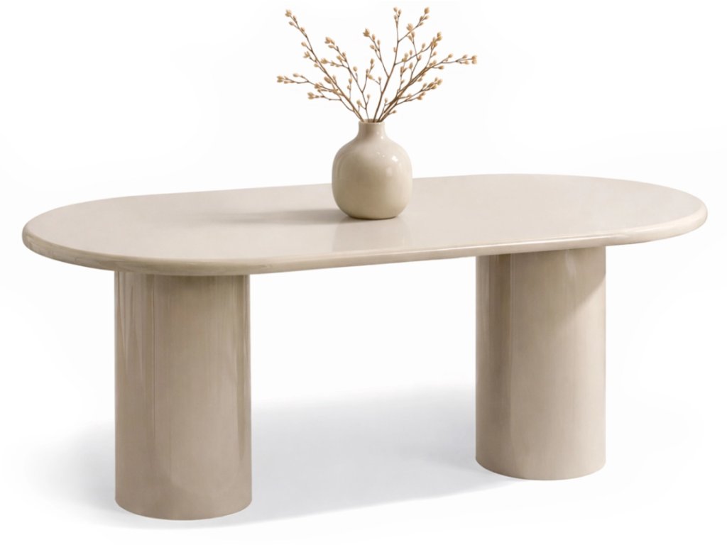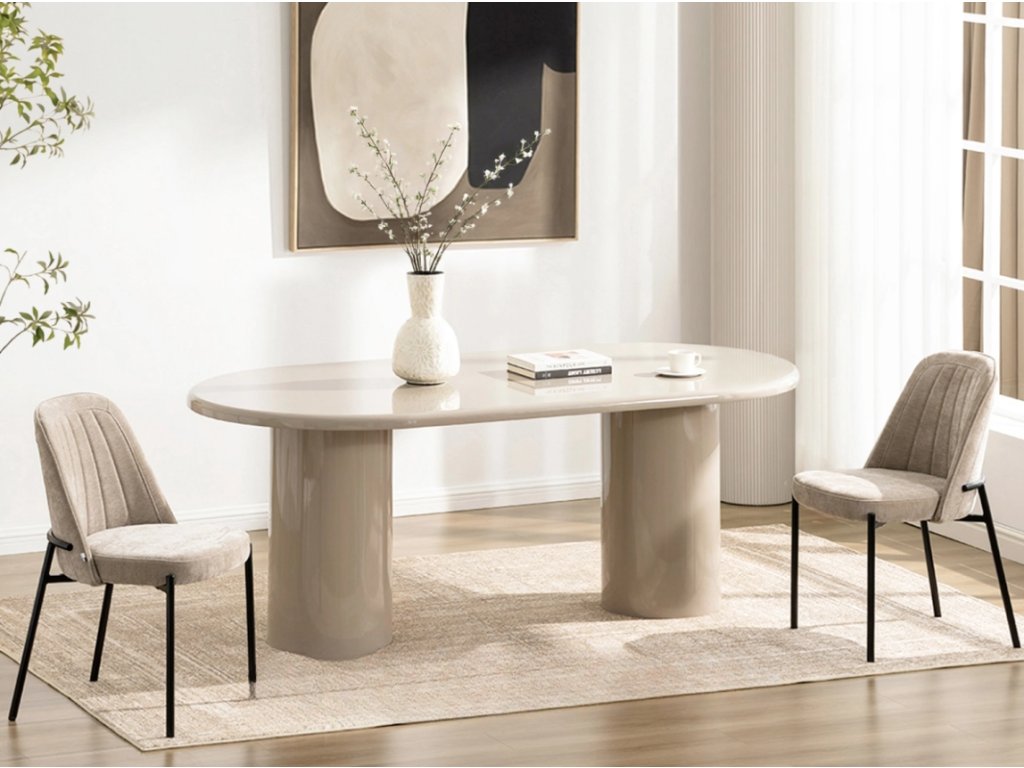 ISLA je perfektným kúskom do súčasných a moderných interiérov . Jeho neutrálna béžová farba a lesklý povrch sa perfektne hodia k rôznym doplnkom a farbám. Jeho oválny tvar dodáva ľahkosť a harmóniu, zatiaľ čo stĺpovité nohy mu dodávajú rafinovaný charakter. Je ideálny do jedální, kuchýň, obývacích izieb a komerčných priestorov. Skombinujte ho s minimalistickými stoličkami alebo mäkko čalúnenými stoličkami a vytvorte útulný a štýlový priestor.