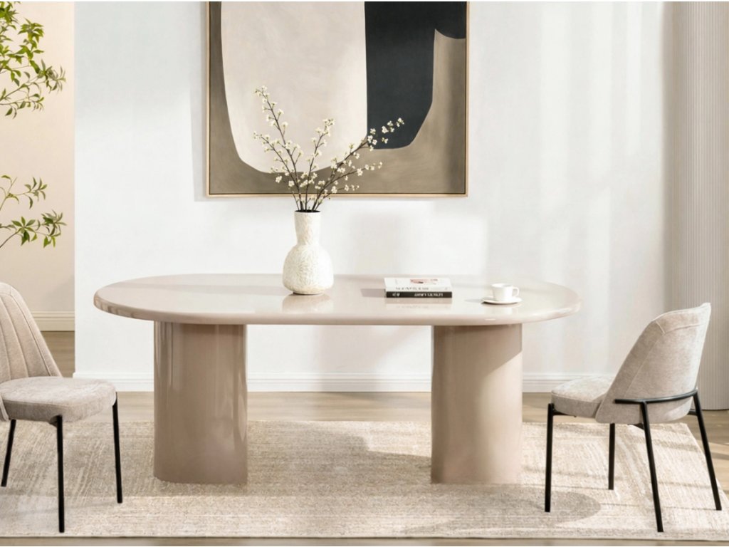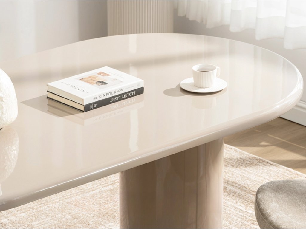 Jeho oválna doska so zaoblenými hranami nielenže púta pozornosť, ale vytvára aj útulnú atmosféru v každom interiéri. Vďaka harmonickému béžovému lesku sa tento stôl stane ústredným bodom vašej jedálne alebo obývačky a pozve vás na spoločné stolovanie a stretnutia.