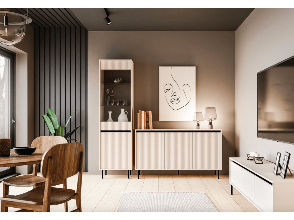 Drážkované predné strany skrinky jej dodávajú jemnú eleganciu, zatiaľ čo dizajn bez úchytiek dodáva kusu nábytku minimalistický, moderný charakter.