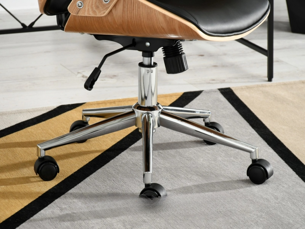 Čierna umelá koža použitá na sedadle a operadle dodáva stoličke, ktorá spočíva na chrómovej nohe s kolieskami, luxusný vzhľad. Nejde však len o estetiku, ale aj o pohodlie a odolnosť. Umelá koža sa ľahko čistí, čo je obzvlášť dôležité pre nábytok používaný denne. Vďaka tomu si otočná kancelárska stolička zachováva svoju krásu po mnoho rokov a zároveň poskytuje výnimočné pohodlie.