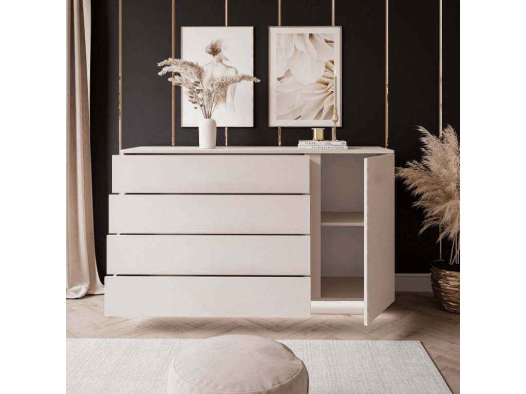 Komoda AMBROSIA v kašmírovej farbe s LED osvetlením je moderným a elegantným riešením pre váš interiér. Vybavený priestrannými zásuvkami a skrinkou, poskytuje štýlový vzhľad a funkčnosť, dokonale sa hodí ku každému zariadeniu.