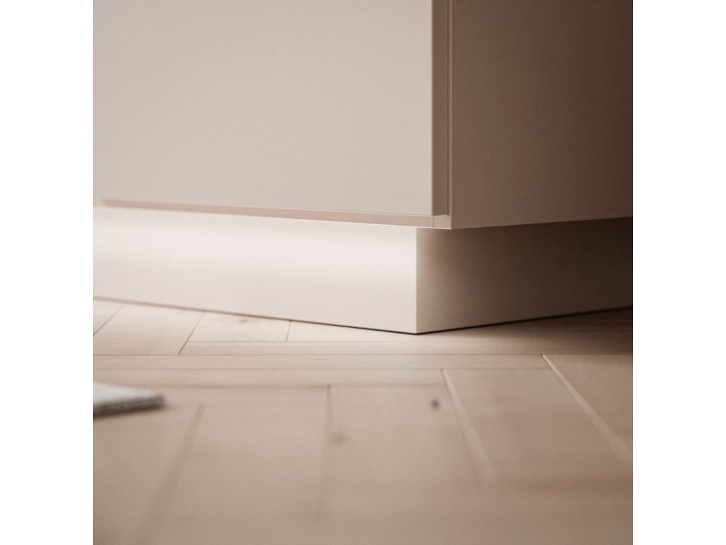 Jedinečná farba kašmíru dodáva komode jemnosť a eleganciu, čo jej umožňuje harmonicky zapadnúť do rôznych interiérových usporiadaní, od moderných až po klasické. Ďalšou výhodou je štýlové LED osvetlenie v studenom bielom odtieni, ktoré vytvára relaxačnú a útulnú atmosféru napomáhajúcu oddychu.