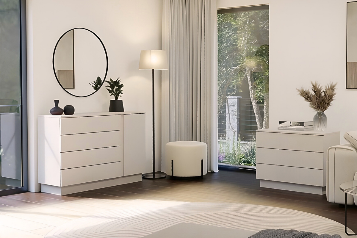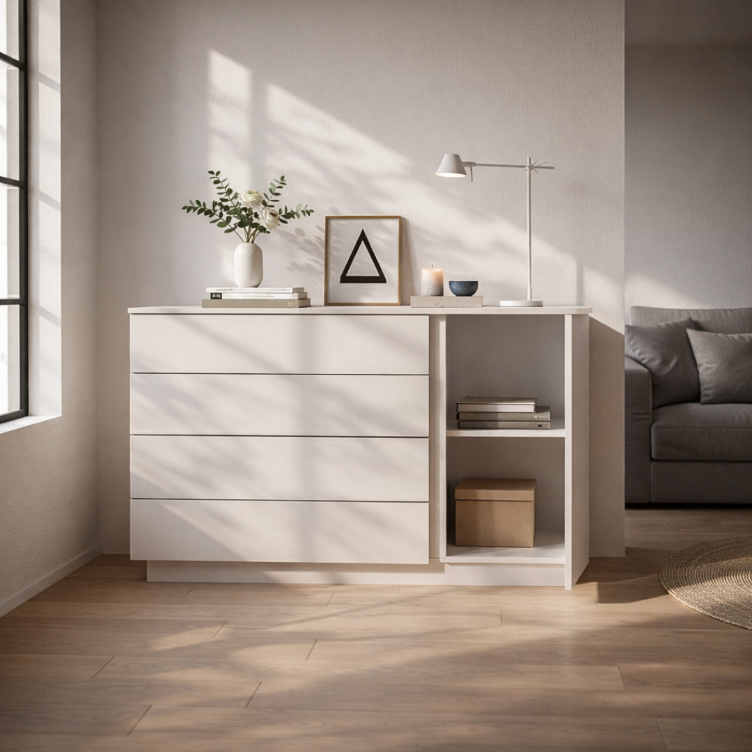 Tip dizajnéra: Kašmírový odtieň pôsobí jemne a nadčasovo. Skombinujte ho s teplým drevom (orech/dub), čiernymi detailmi a jedným výrazným doplnkom (napr. keramika alebo obraz) - komoda bude pôsobiť luxusne, ale stále ľahko.