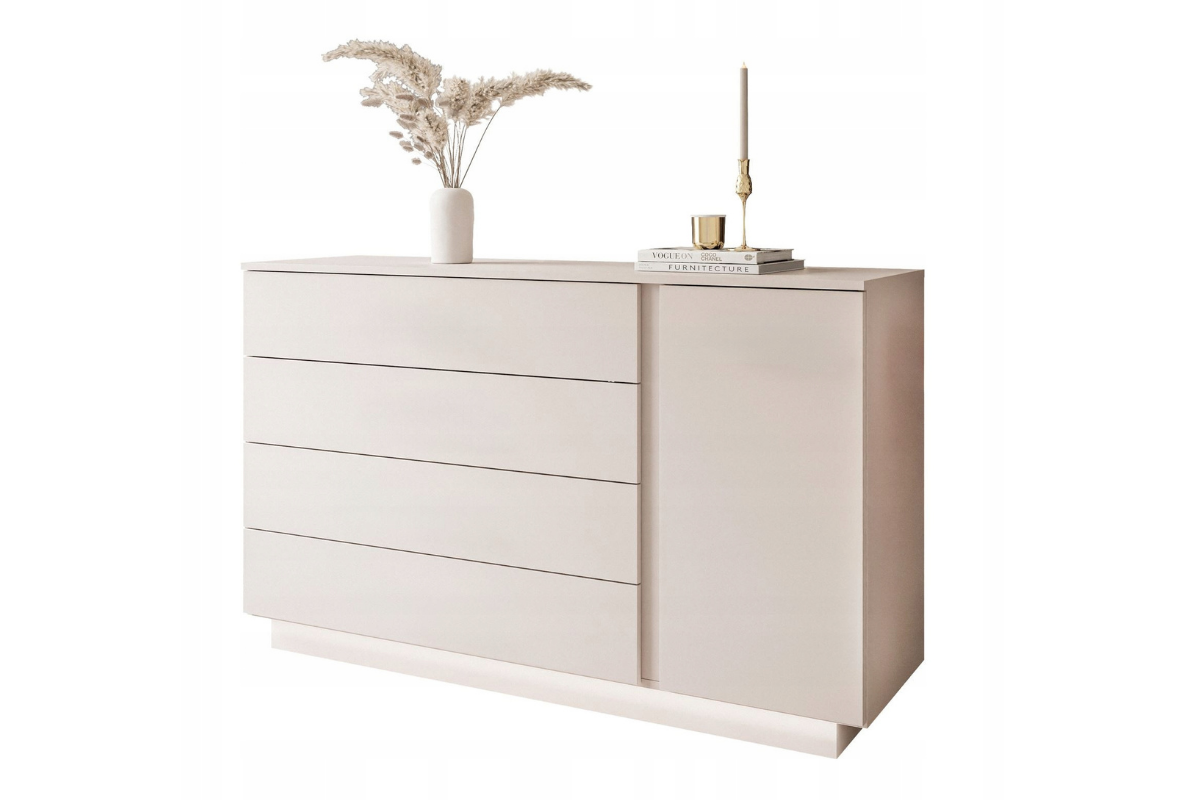 Komoda AMBROSIA v kašmírovej farbe je moderným a elegantným riešením pre váš interiér. Vybavený priestrannými zásuvkami a skrinkou, poskytuje štýlový vzhľad a funkčnosť, dokonale sa hodí ku každému zariadeniu.