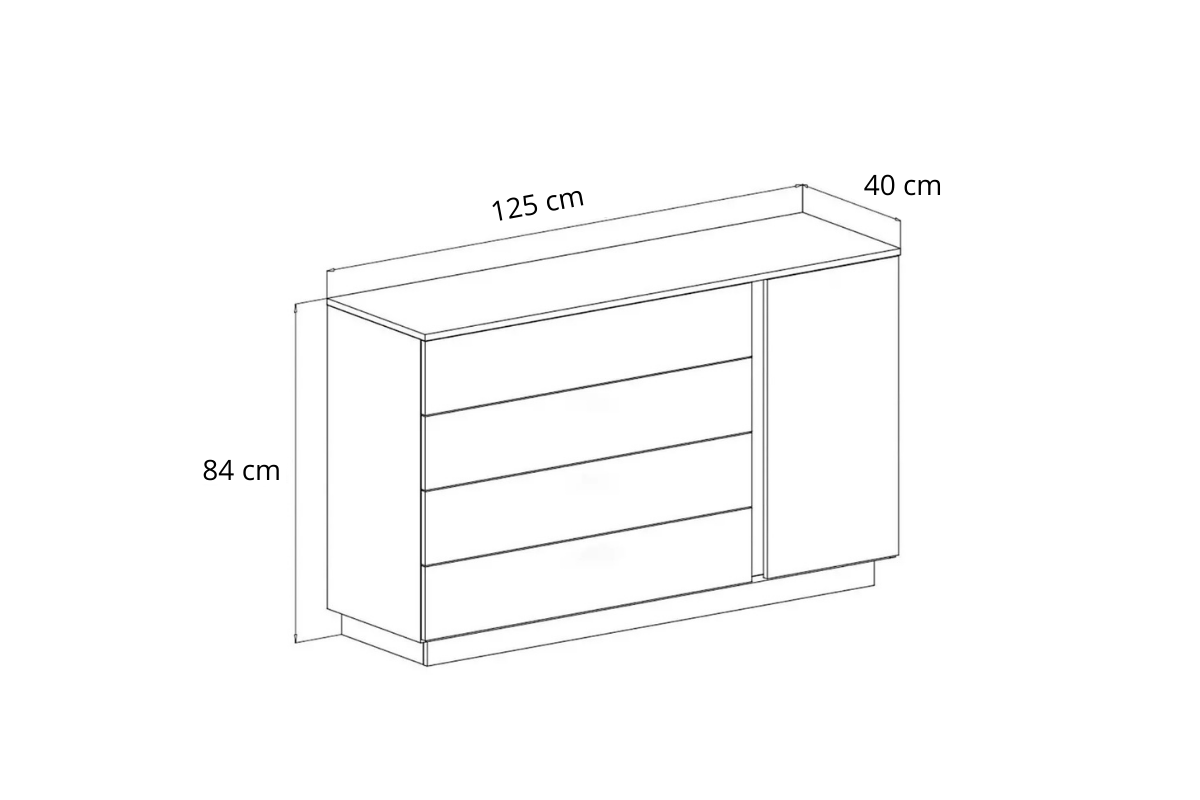 Komoda AMBROSIA ponúka kombináciu zásuviek aj uzatvoreného úložného priestoru, takže sa hodí na oblečenie, dokumenty, hračky aj doplnky do domácnosti. LED podsvietenie v sokli zvýrazní nábytok vo večernom režime a dodá interiéru moderný „hotelový“ efekt.
