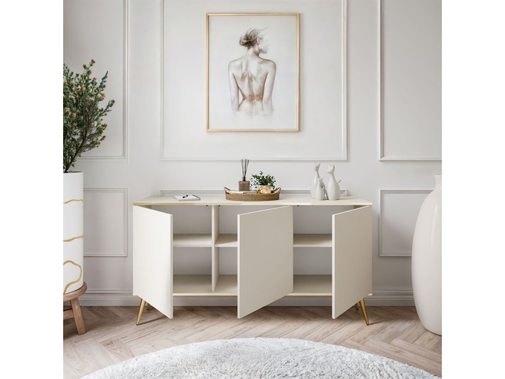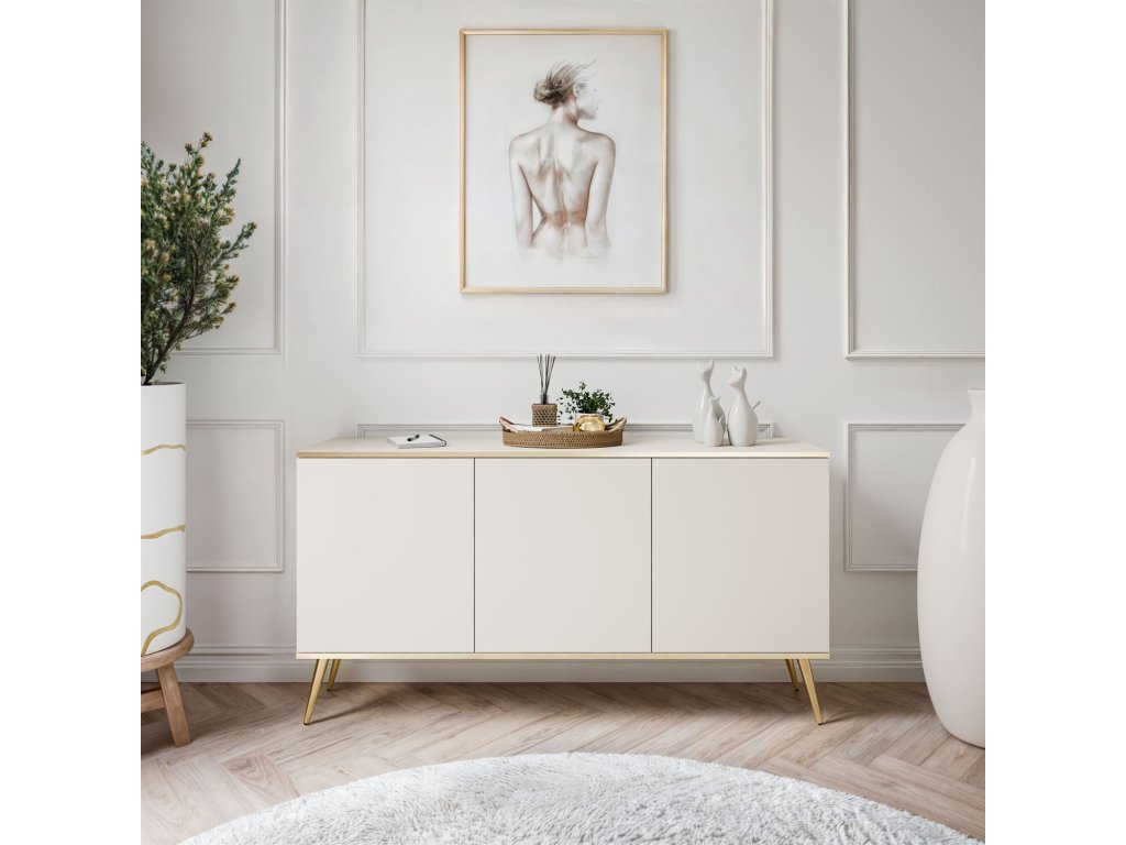 Komoda BOSTON je elegantnou a funkčnou voľbou do obývačky, spálne a chodby. Jeho moderný dizajn kombinuje jednoduché čelá s jemnými zlatými detailmi, čo dodáva nábytku jedinečný charakter. Priestranný interiér ponúka praktický úložný priestor a systém otvárania push-to-open zaisťuje jednoduché používanie.
