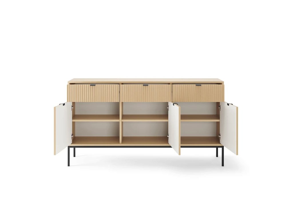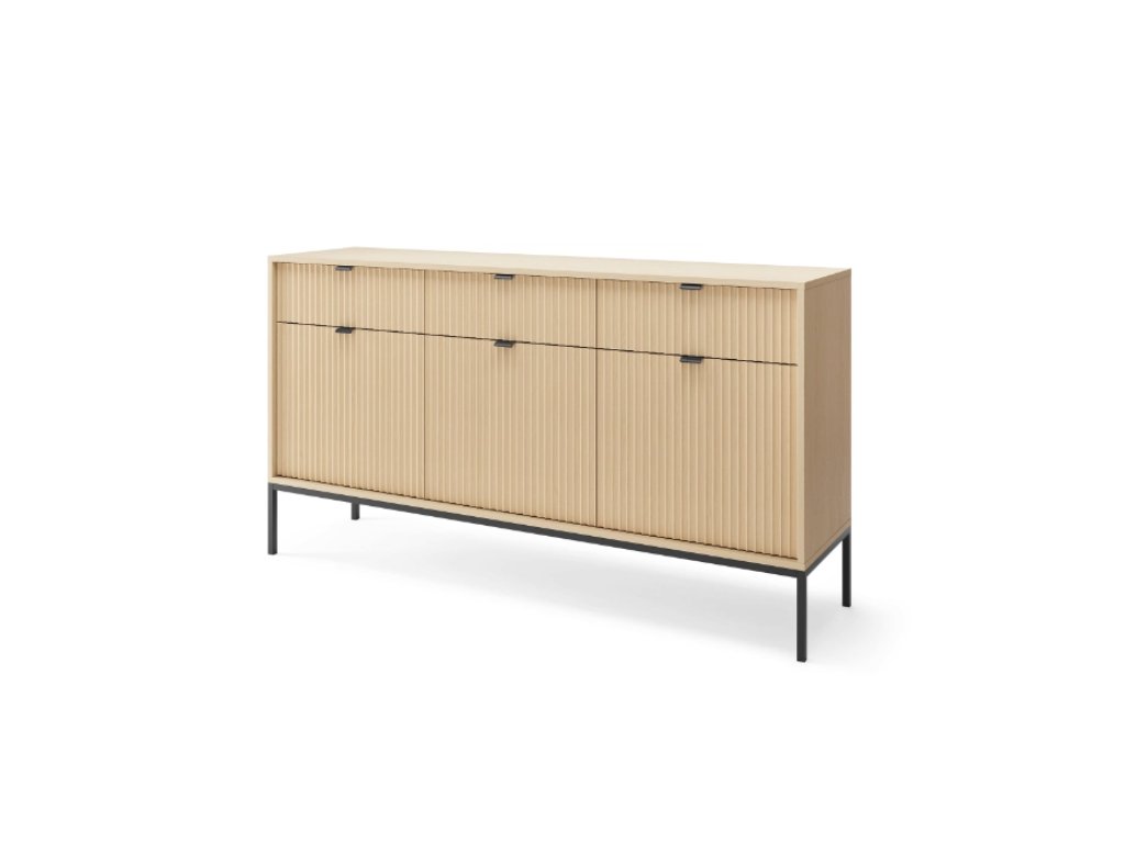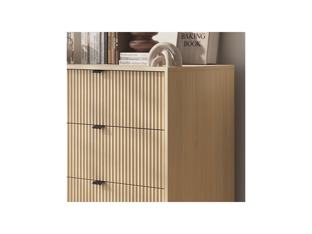 Dizajnová a elegantná forma s ozdobnými drážkami na predných stranách nesmie chýbať pre milovníkov moderného dizajnu. Kovový podstavec dodáva konštrukcii ľahkosť a celok dopĺňajú ozdobné čierne úchytky. Tiché zatváranie skriniek.