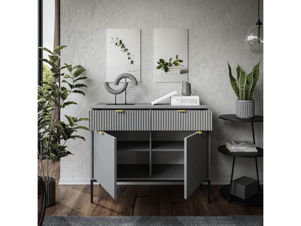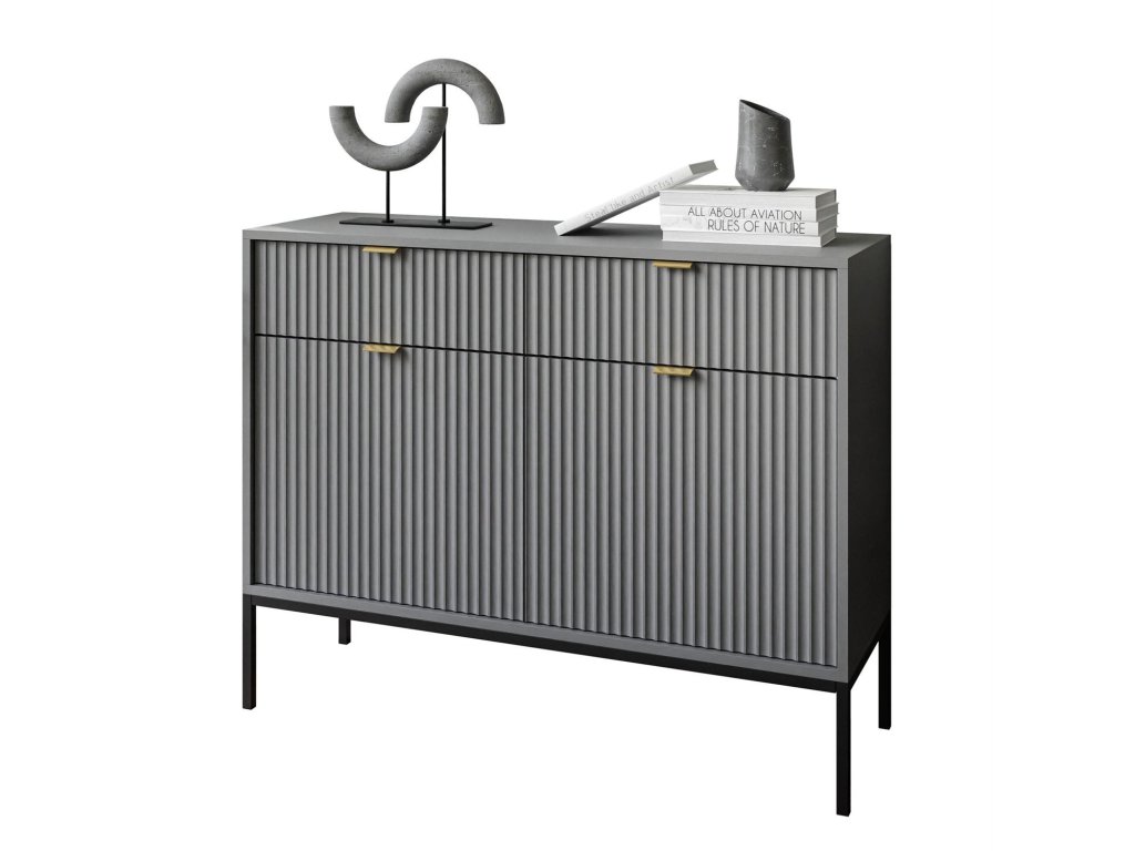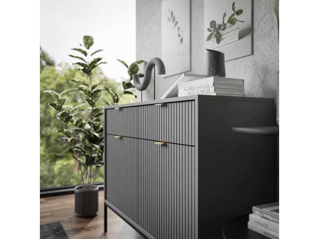 Jednoduchá, ale elegantná forma s ozdobnými drážkami na predných stranách nesmie chýbať pre milovníkov moderného dizajnu. Kovový podstavec dodáva konštrukcii ľahkosť a celok dopĺňajú ozdobné zlaté úchytky.